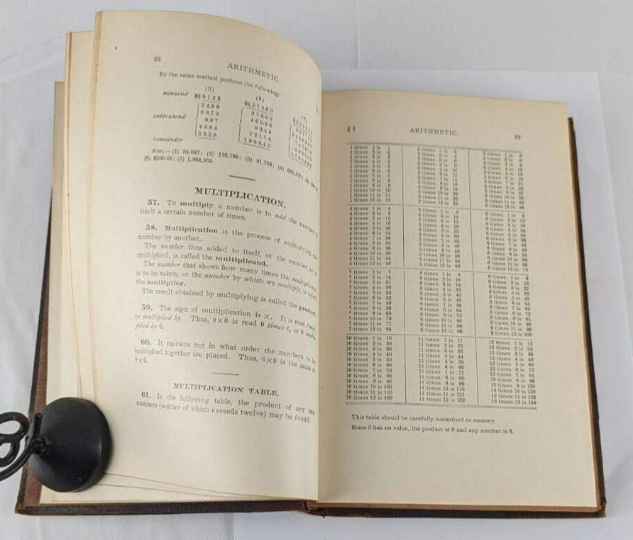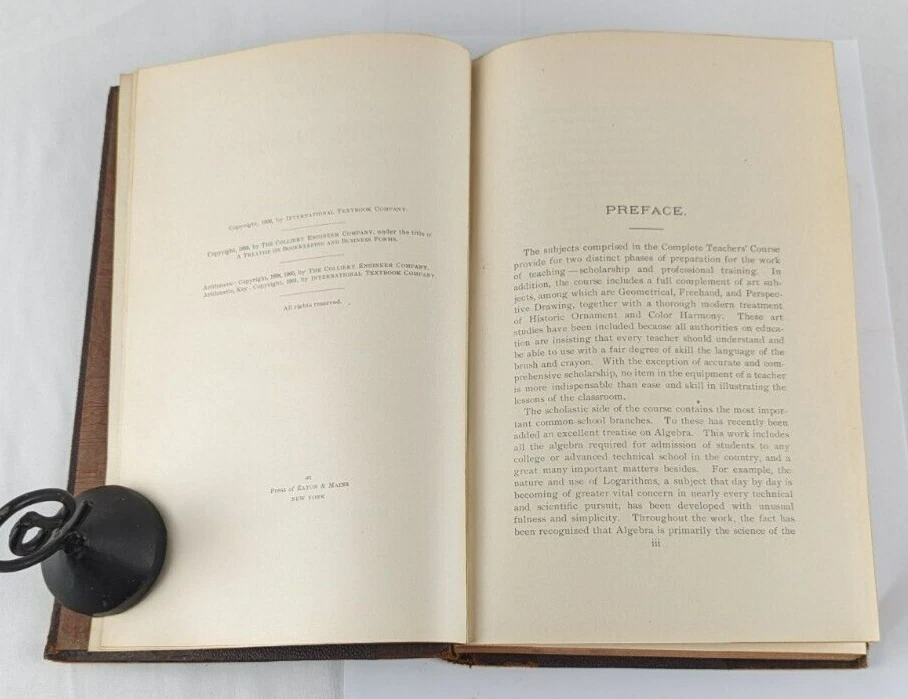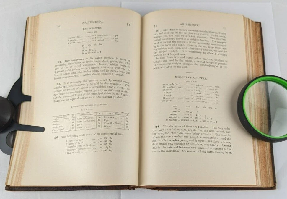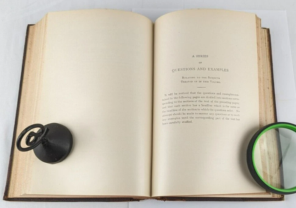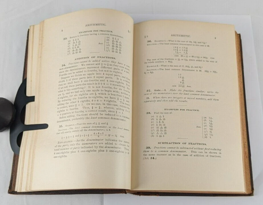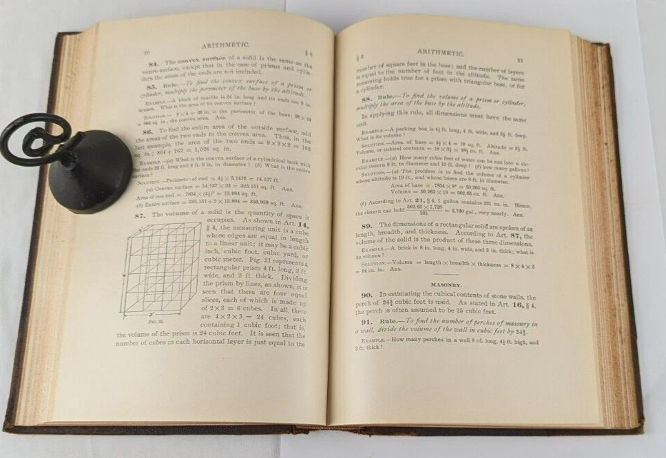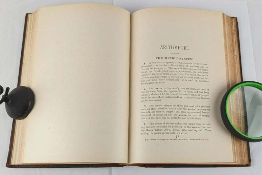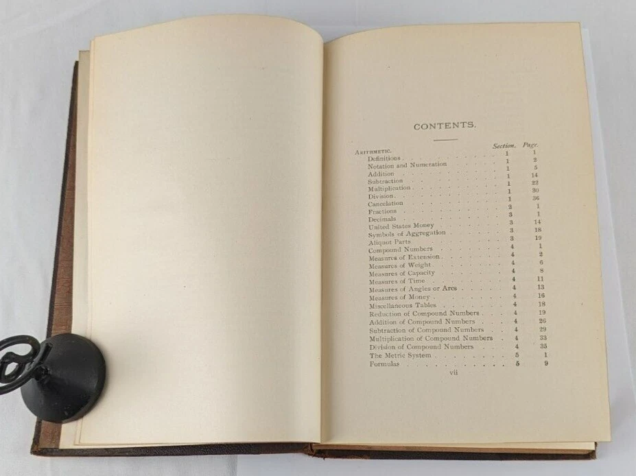 This antique math textbook from 1902 covers topics such as arithmetic, as well as accounting, investment, interest, and insurance calculations. The partial leather-bound book was published by International Textbook Company in Scranton PA, United States. It is a great addition to any collection of antiquarian and collectible books. The book's subject matter is arithmetics and it is relevant to anyone interested in the history of mathematics. The year printed is clearly indicated.