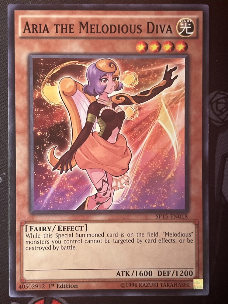 The product is a "Aria the Melodious Diva" card from the "Star Pack Arc-V" set of the Yu-Gi-Oh! TCG. This Fairy-type card has a defense of 1200 and an attack power of 1600. It is a Common card with a rarity of Short Print and is in English. Manufactured by Konami, this card is a 1st Edition and is numbered SP15-EN018. Perfect for collectors and players alike, this card is a valuable addition to any Yu-Gi-Oh! card collection.