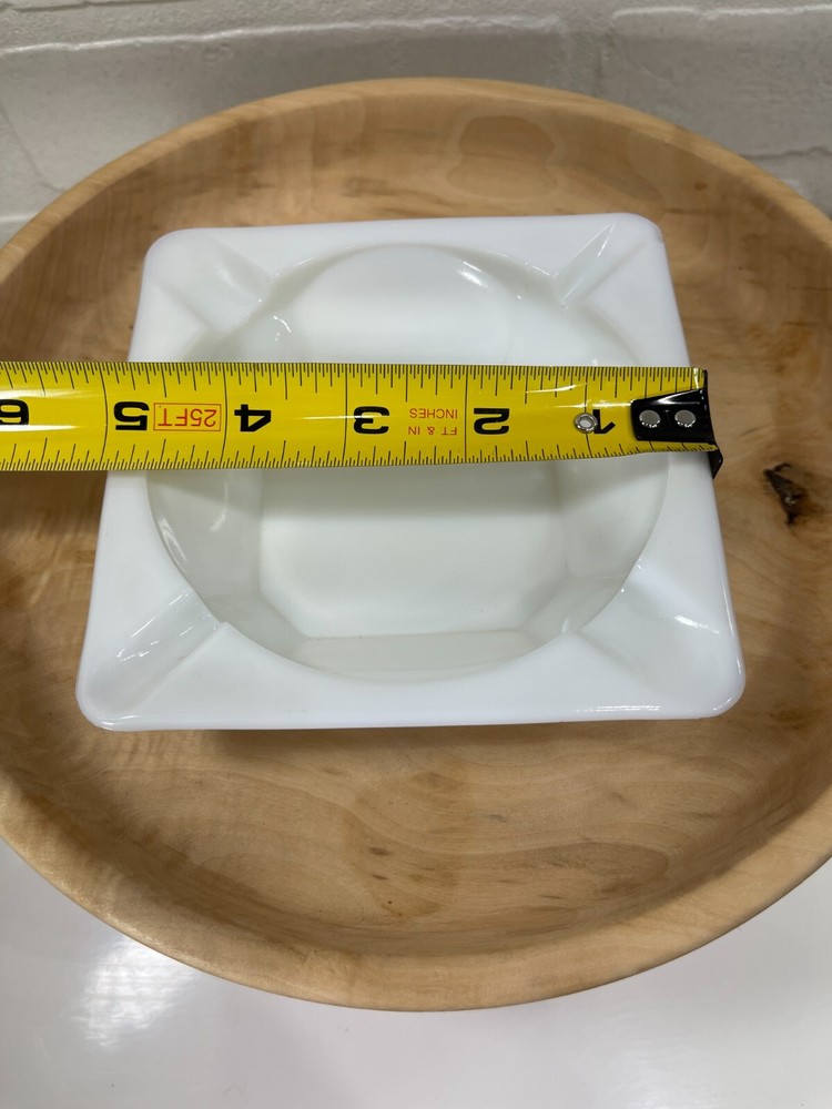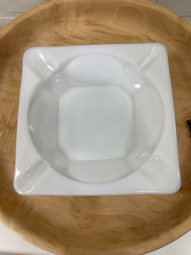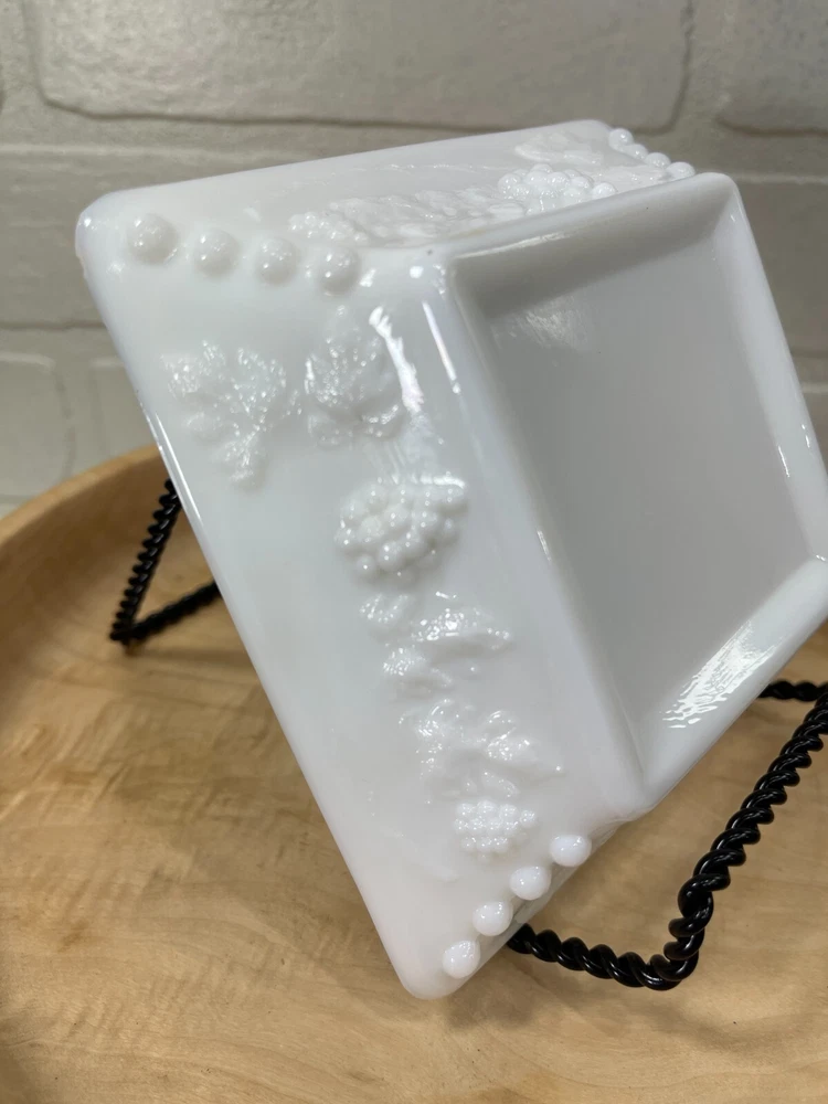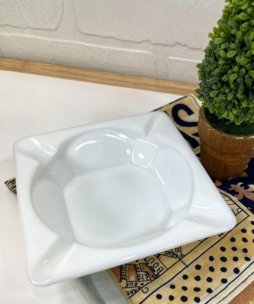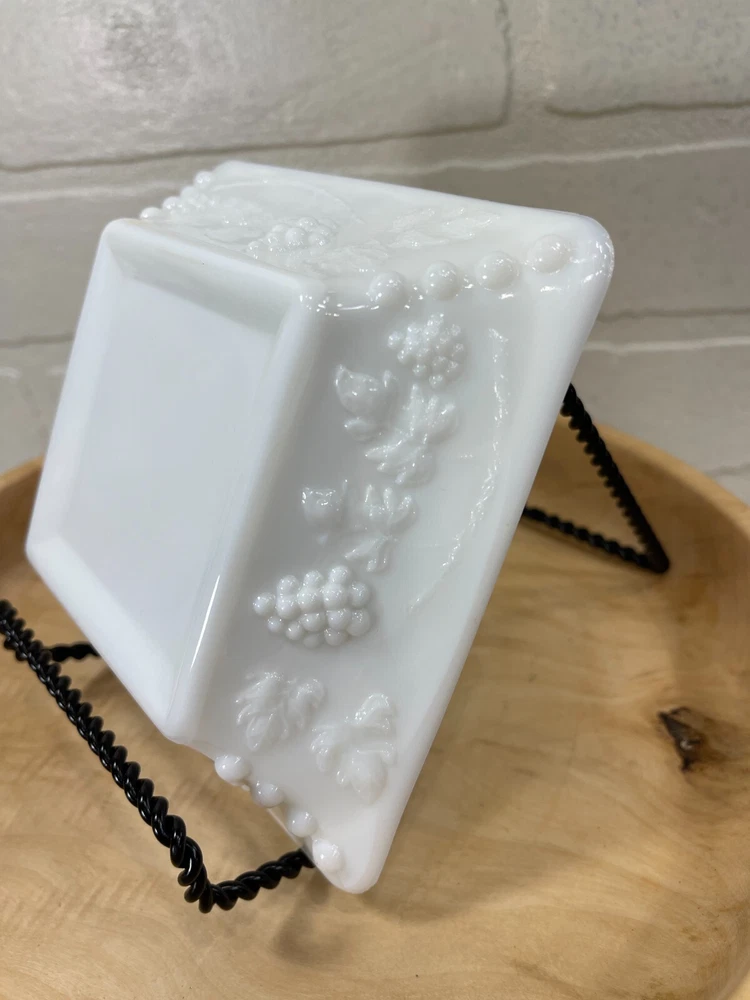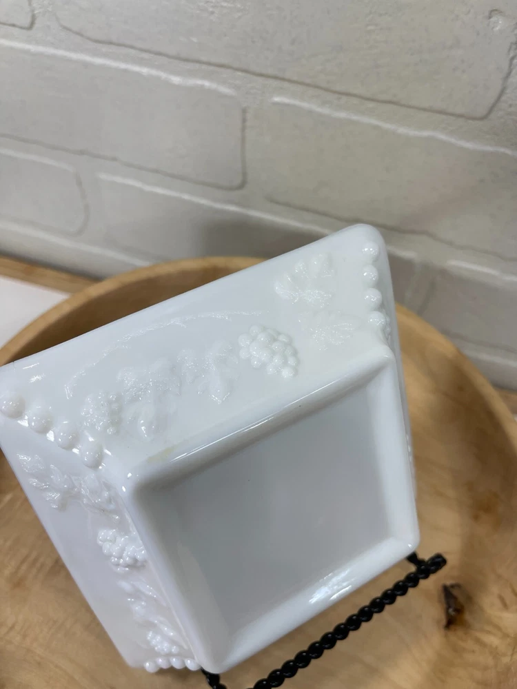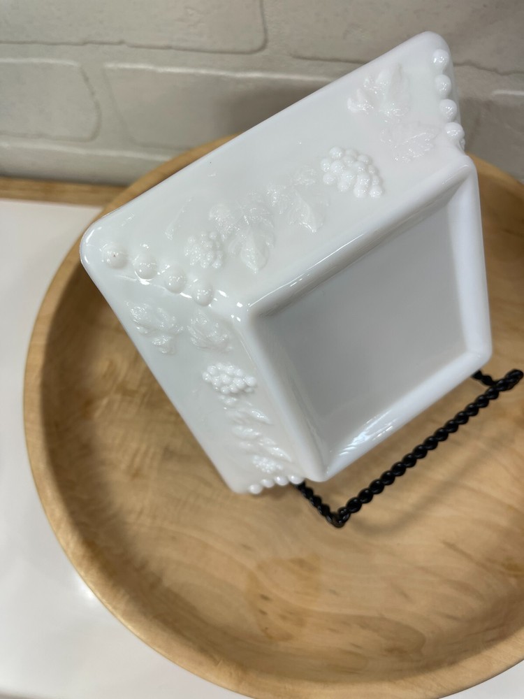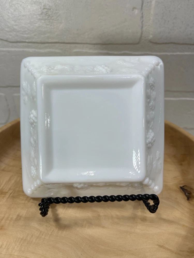Vintage milk glass ashtray grape and leaves design on the outside. Size of ashtray is 5" x 5". Excellent condition.