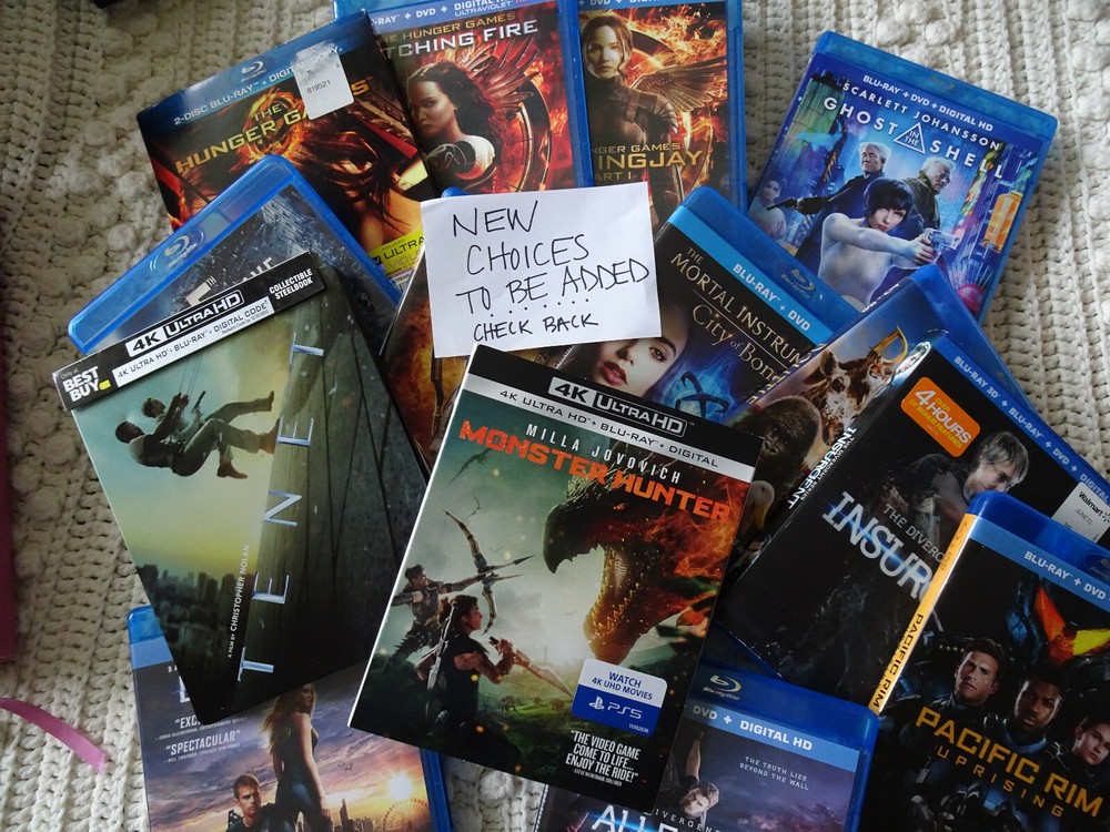 assorted SCI FI blu-ray/DVD or blu-ray only movies --- YOUR CHOICE NEW never watched (opened only to remove digital copy) NO DIGITALS in this listing --------------------------------------- Snow White & the Huntsman blu-ray only The Huntsman Winter's War Extended Edition blu-ray/DVD with sip cover Transformers - The Last Knight blu-ray/DVD with slipcover MIB International blu-ray/DVD with slipcover AD Astra blu-ray only with slipcover Oblivion blu-ray/DVD with slipcover Tarzan blu-ray/DVD with slipcover Jack the Giant Slayer blu-ray/DVD with slipcover Divergent blu-ray/DVD with DIGITAL The Divergent Series - Allegiant blu-ray/DVD The Divergent Series - Insurgent blu-ray/DVD with Lenticular slipcover Dolittle blu-ray/DVD The Mortal Instruments - City of Bones blu-ray/DVD Gods of Egypt blu-ray only Geostorm blu-ray only The 5th Wave blu-ray only The Hunger Games - 2 disc blu-ray with slipcover The Hunger Games - Catching Fire blu-ray/DVD The Hunger Games - Mockingjay part 1 blu-ray/DVD Ghost in the Shell blu-ray/DVD Pacific Rim - Uprising blu-ray/DVD Monster Hunter 4K/blu-ray with slipcover Tenet STEELBOOK 4K/blu-ray Rise of the Planet of the Apes blu-ray/DVD Dawn of the Planet of the Apes blu-ray War for the Planet of the Apes blu-ray/DVD with slipcover Love and Monsters 4K/blu-ray with slipcover Godzilla 4K/blu-ray with slipcover The Meg blu-ray only Jurassic World - Fallen Kingdom blu-ray only with slipcover The 5th Wave blu-ray After Earth blu-ray/DVD Independence Day - 2 Movie Collection blu-ray ----------------------------------------