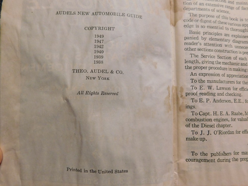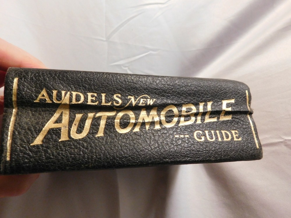 Vintage and pre-owned Audels New Automobile Guide for Mechanics, Operators and Servicemen with questions and answers and illustrations by Frank D. Graham. Soft-cover, black leather cover. This book was published 1949. Has 1,607 pages with lots of illustrations. Measures approx. 6.5" x 5". Condition: Good binding, no loose pages, covers have wear and marks, pages will have some creases and also spotting/wear with some stains. Some pages have tears towards the lower right where it's blank. Most of this will be towards the beginning of the book. These descriptions do not interfere with the reading of the book. Sold as is used and vintage. Thanks for looking.