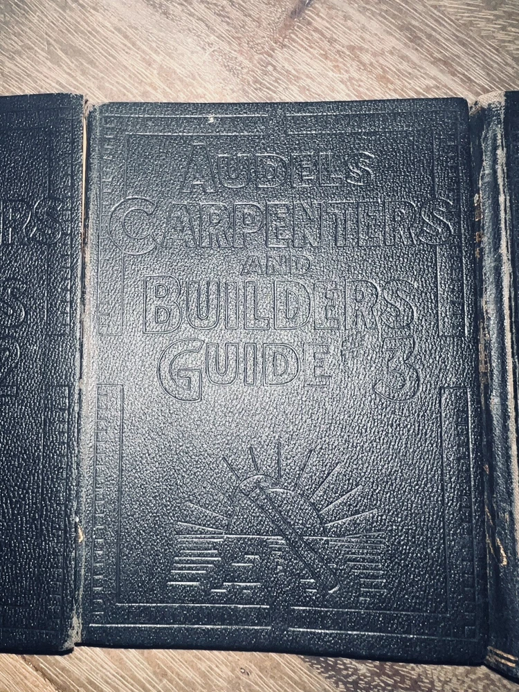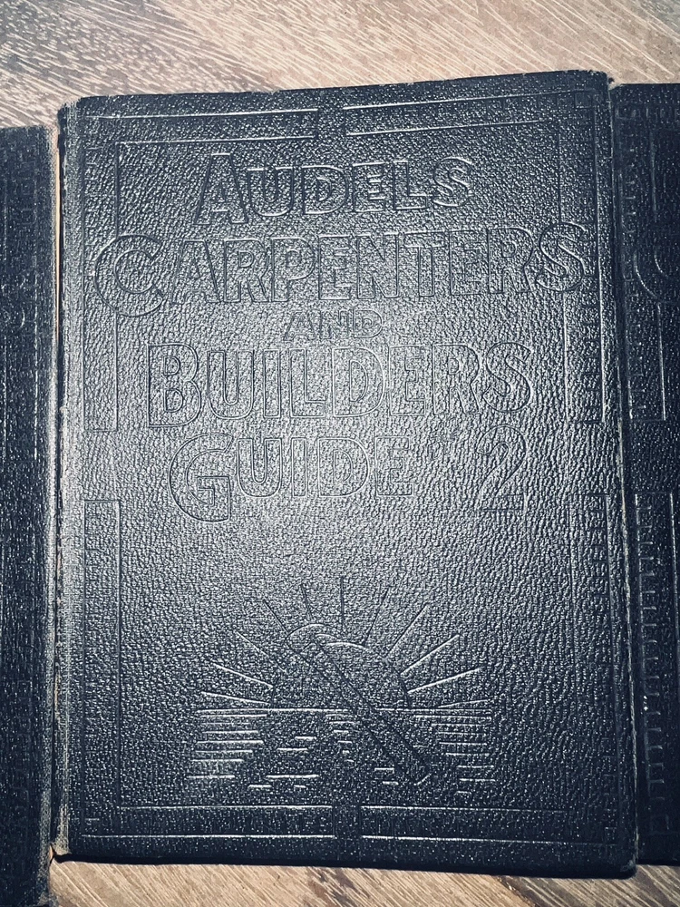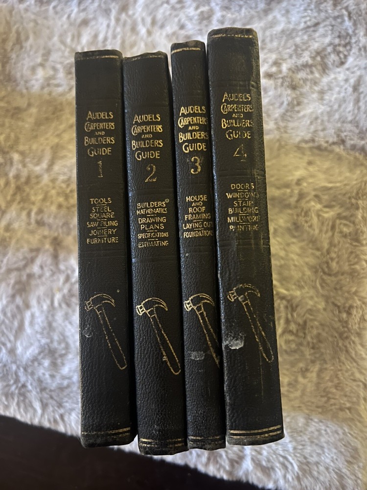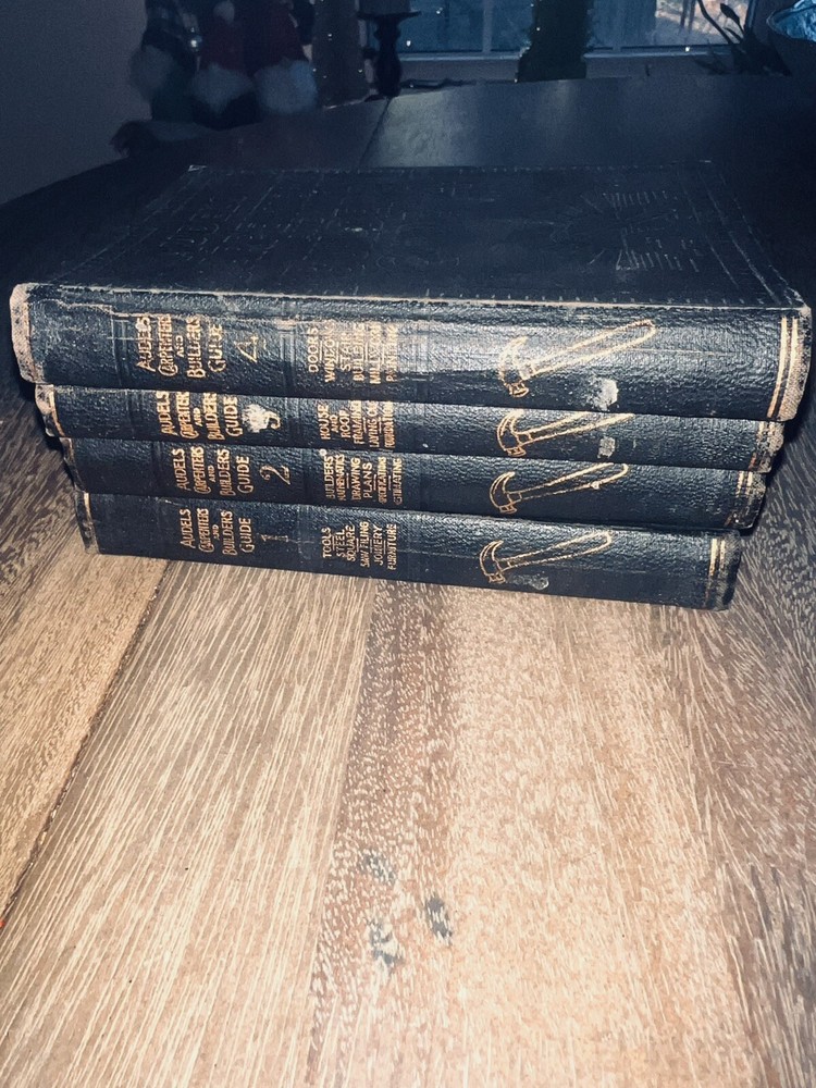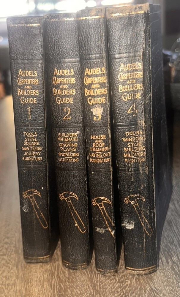 The product is a first edition set of four volumes of "Audels Carpenters And Builders Guide" from 1923. The books are bound in leather and written in English, focusing on the subject of carpentry. This comprehensive guide is a valuable resource for individuals interested in learning about carpentry techniques and practices from the early 20th century. Being over a 100 years old books are in good used condition.