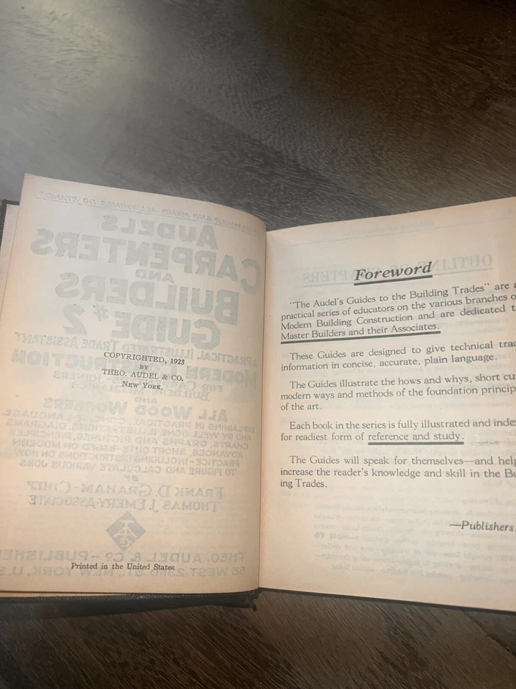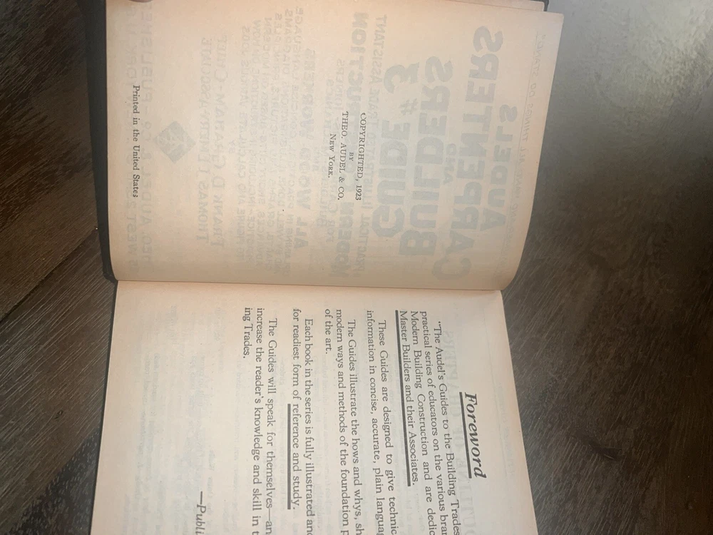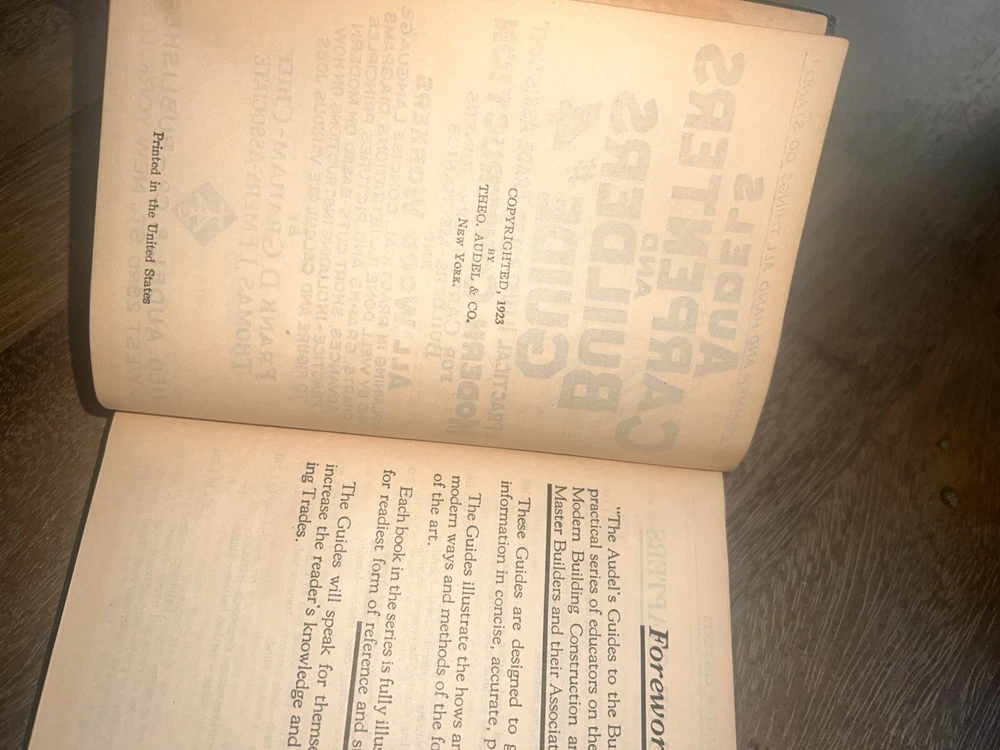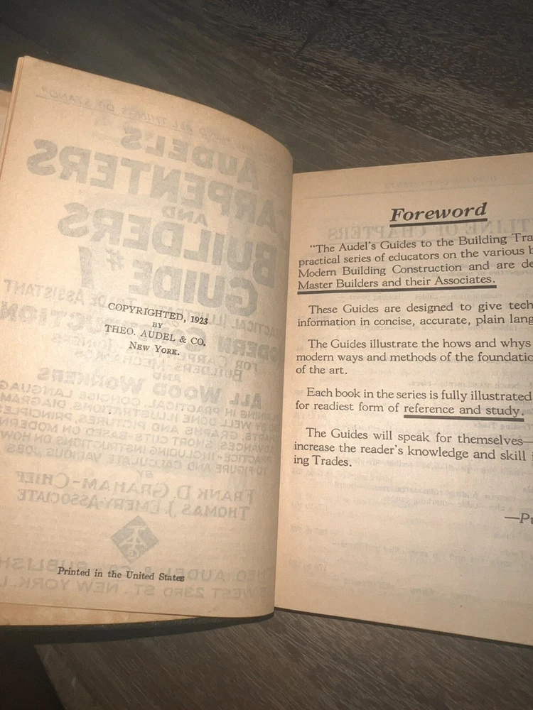 The product is a first edition set of four volumes of "Audels Carpenters And Builders Guide" from 1923. The books are bound in leather and written in English, focusing on the subject of carpentry. This comprehensive guide is a valuable resource for individuals interested in learning about carpentry techniques and practices from the early 20th century. Being over a 100 years old books are in good used condition.