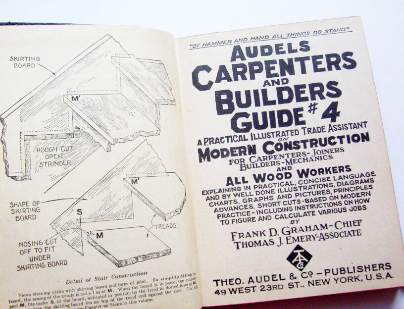 1947, Theo Audel & Co., NY 457 pp, 5 x 6 3/4 "For carpenters, joiners, builders, mechanics and all wood workers explaining in practical concise language and by well done illustrations, diagrams, charts, graphs and pictures, principles advances, short cuts-based on modern practice-including instructions on how to figure and calculate various jobs." --You must see my Ebay bookstore-Great Pandas At the top of this page click on: Visit store. Sort: ending soonest, to shop by orderly categories.