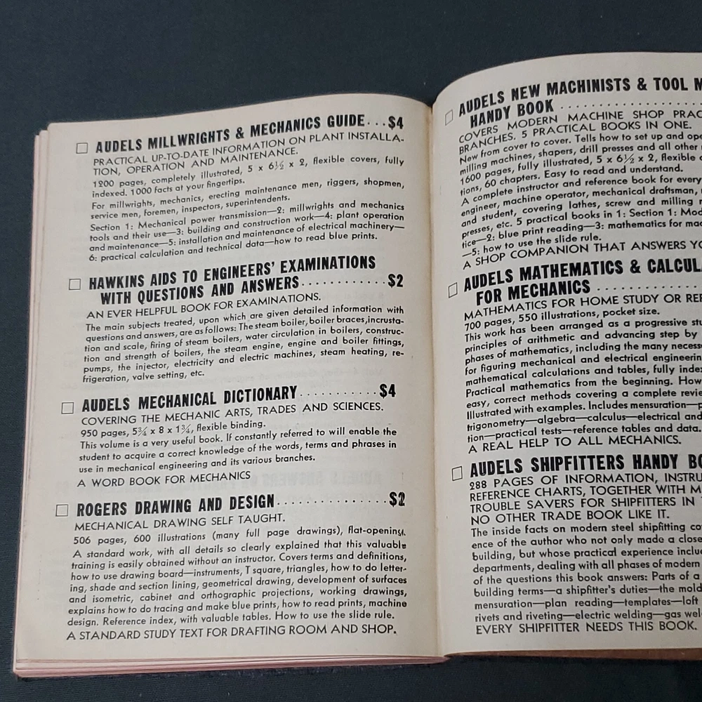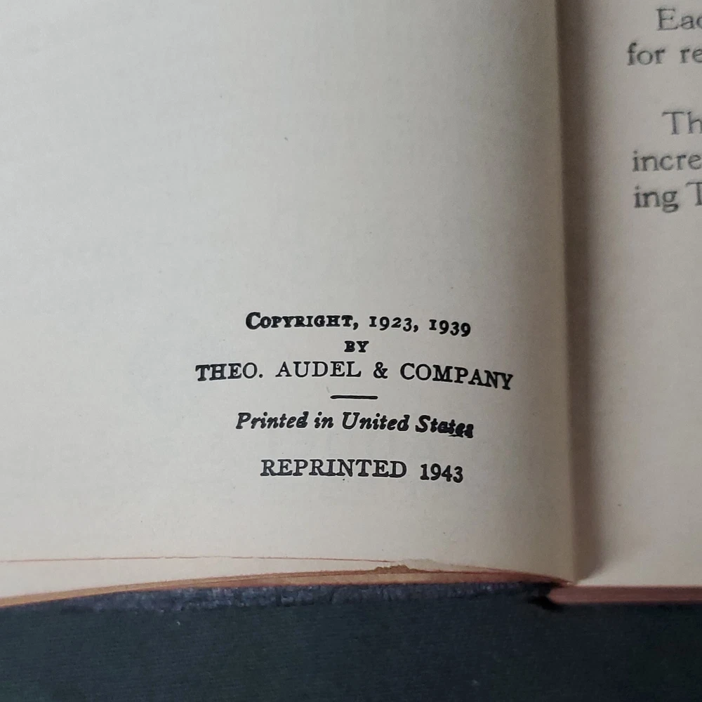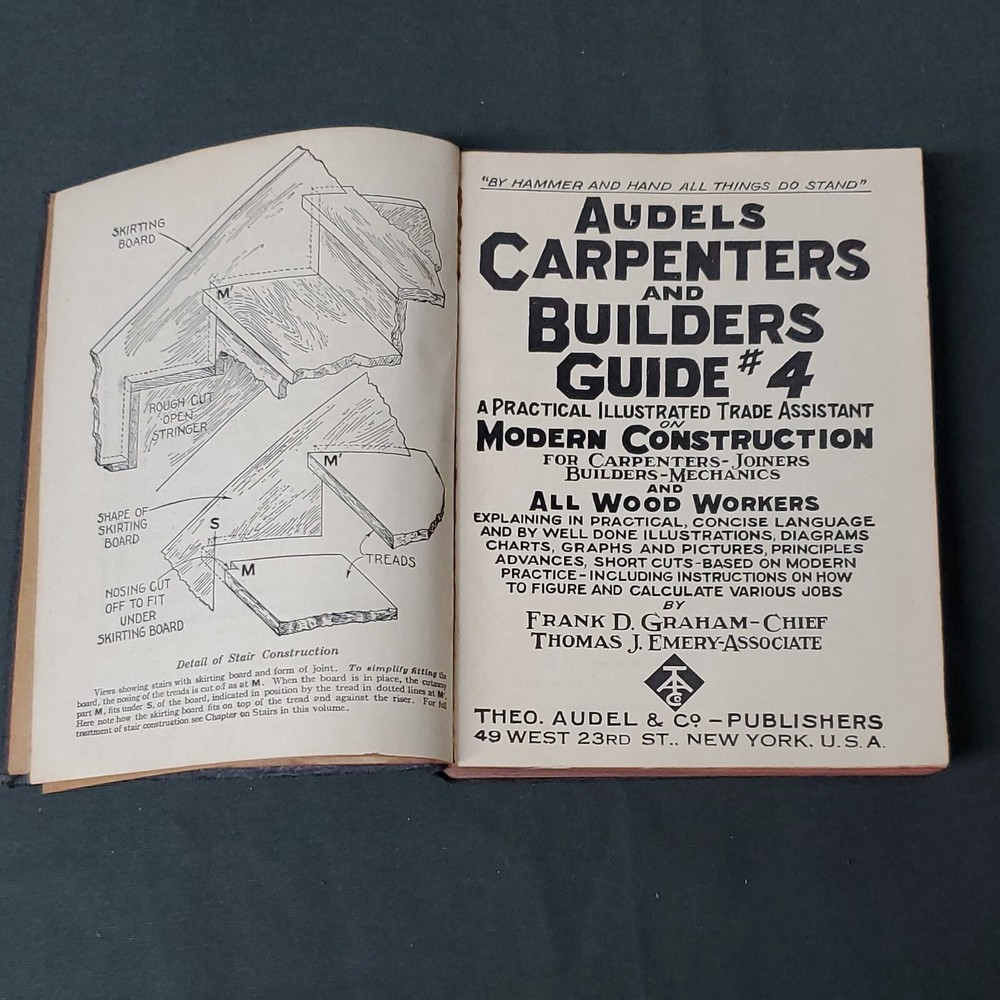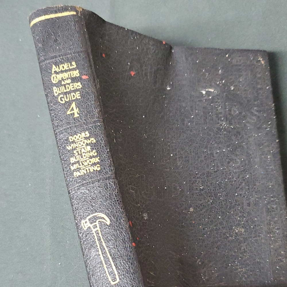 Audels Carpenters & Builders Guide 4, 1943 Reprint Theo Audel & Co Illustrated ©️1939 This vintage guidebook is a must-have for any builder or Carpenter. Published by Theo. Audel & Co in 1943, this is book 4 in the series of illustrated guides providing practical advice for modern construction at the time. It includes practical illustrated trade assistance on modern Construction for carpenters, joiners, builders, mechanics and all wood workers. Excellent vintage condition. Edges of pages are still sharp. No rips or tears. Beautiful book to add to your collection or as a gift. Appears to have a little paint splatter. Tight binding, no loose pages. Gold lettering on spine is bright. Weight is 13 oz before packaging. 5 × 6½" Offers always considered. Thank you for looking. PS2-1db.032624.14.9