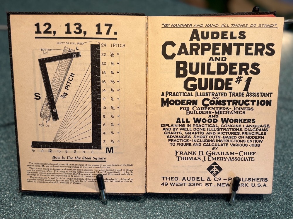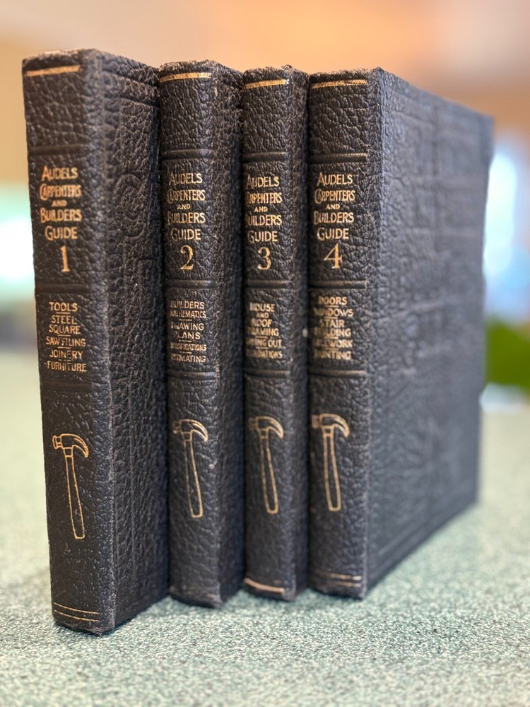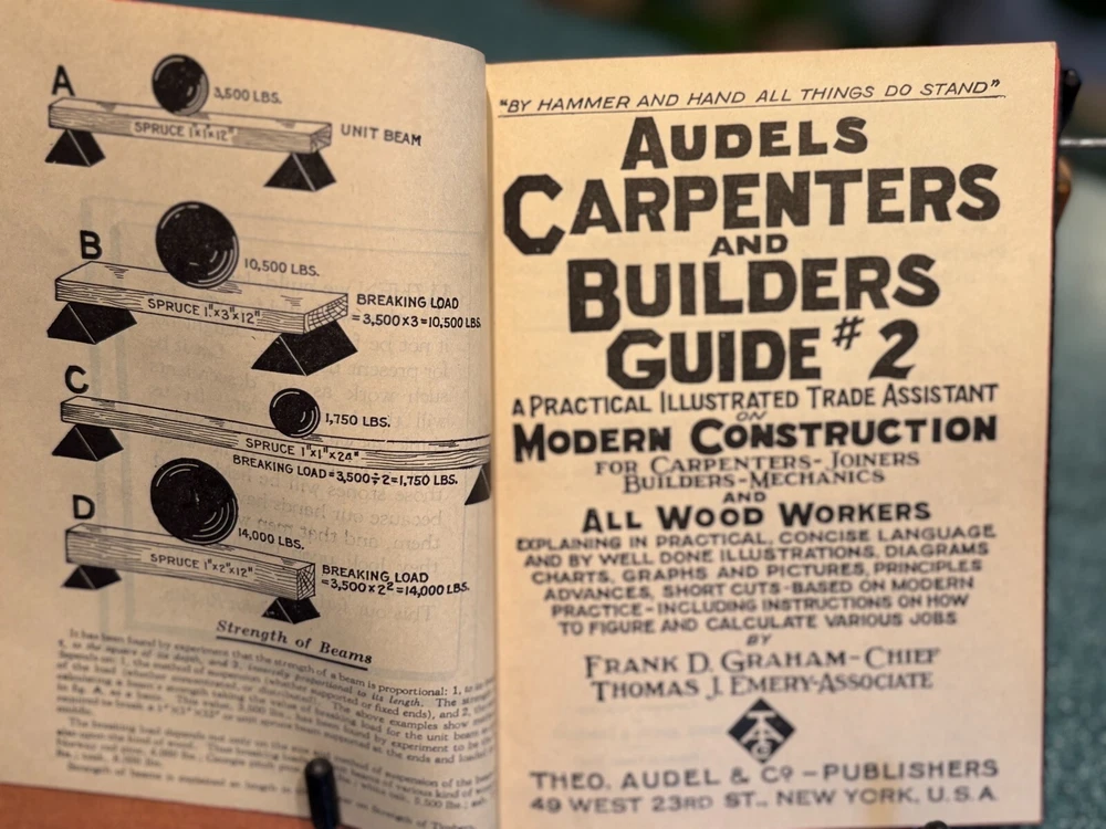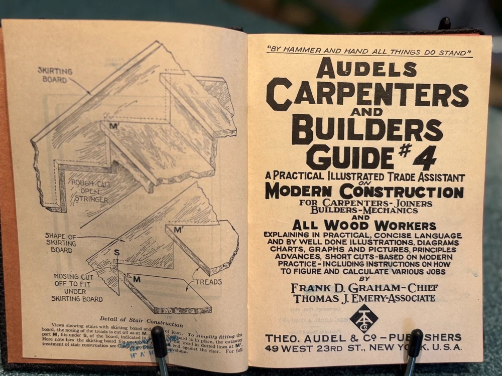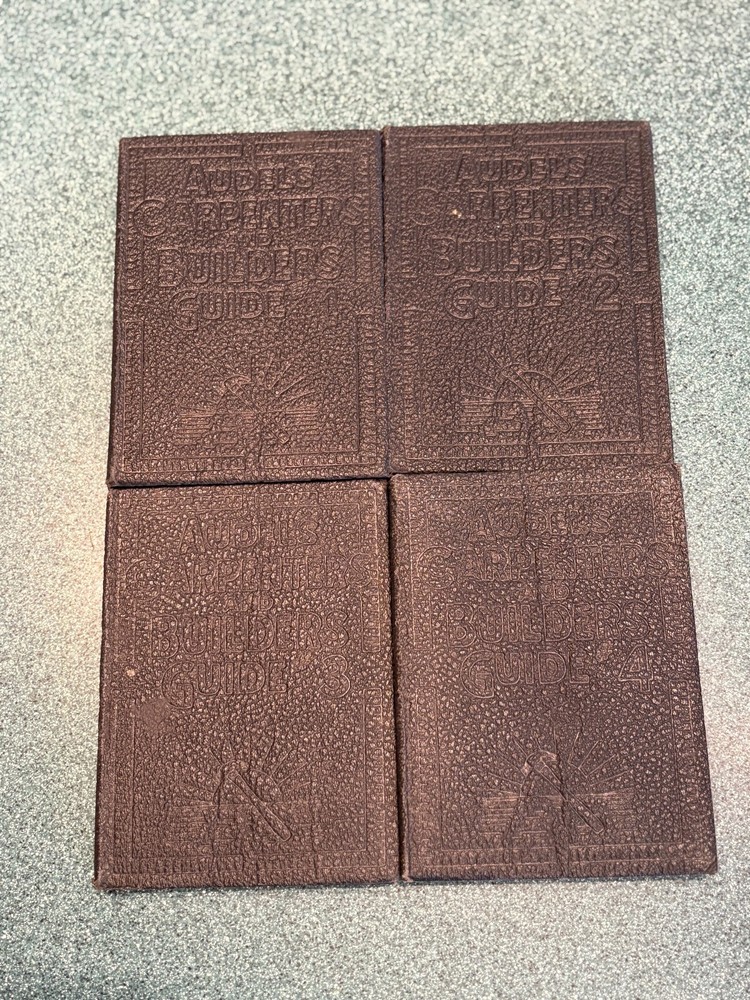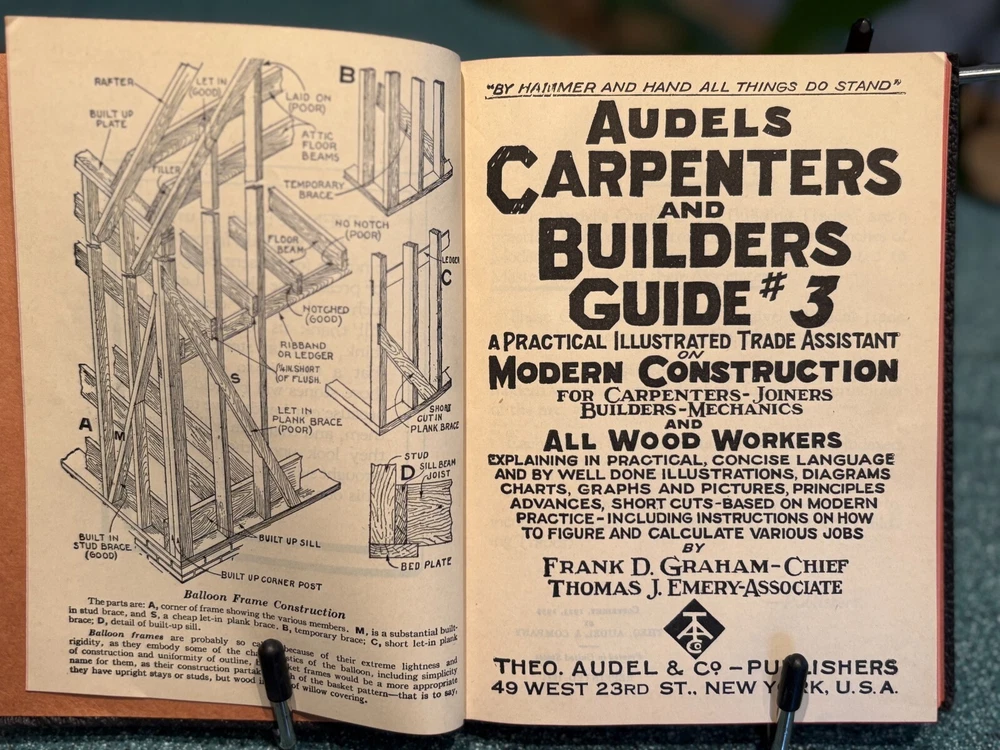 "Audels Carpenters and Builders Guide: A Practical Illustrated Trade Assistant on Modern Construction for Carpenters-Joiners, Builders-Mechanics, Explaining in Practical, Concise Language and by Well Done Illustrations and Diagrams, Charts, Graphs and Pictures, Principles, Advances, Short-cuts—Based on Modern Practice—Including Instructions on How to Figure and Calculate Various Jobs," by Frank D. Graham-Chief, and Thomas J. Emery-Associate. First published in 1923, this is the reprint of 1944. In all, 1,546 pages, with advertisements for other books from the same publisher in the rear of each volume. I pack carefully and ship promptly, free via USPS Media Mail.