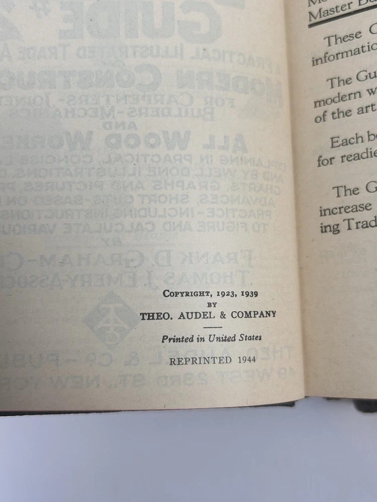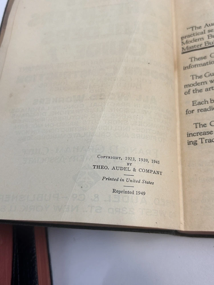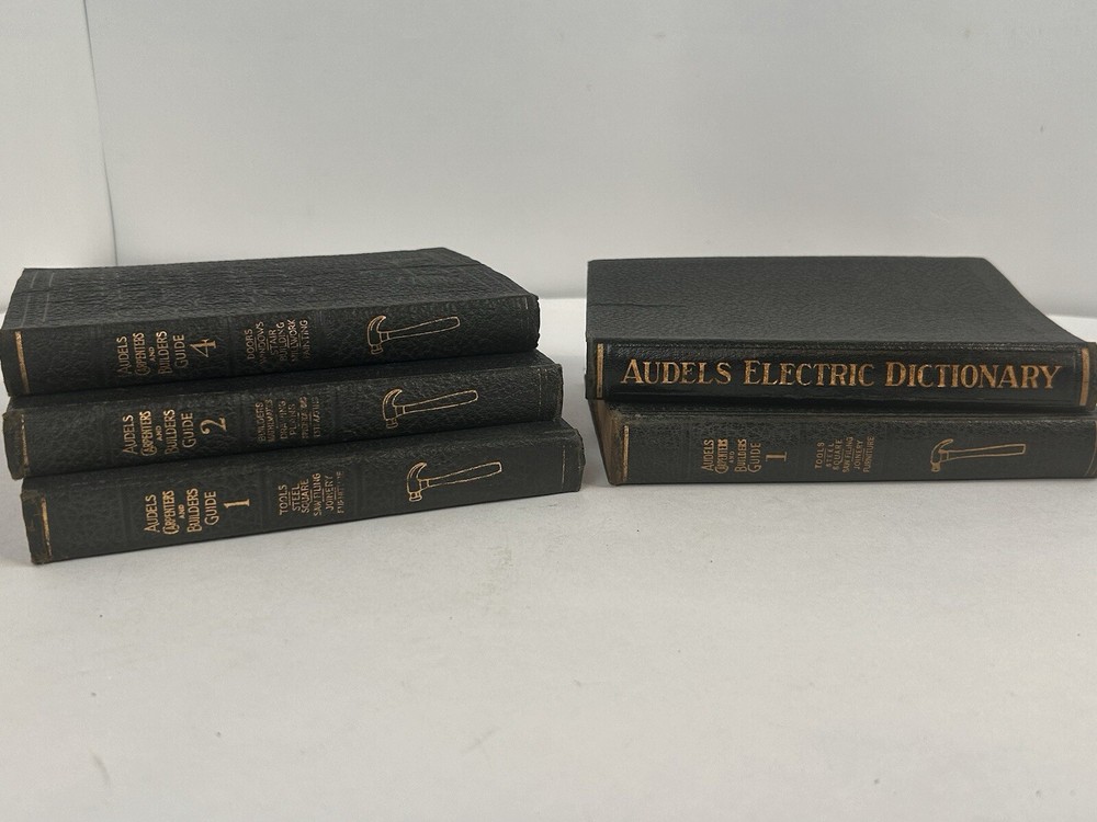Audels Carpenters and Builders Guide 1,2,4 Incomplete Set 1944 Reprint Extras Incomplete set(1,2and4) of 1944 reprint in very nice condition Guide 1 1949 reprint in worse condition Audels electric dictionary 1946 nice condition