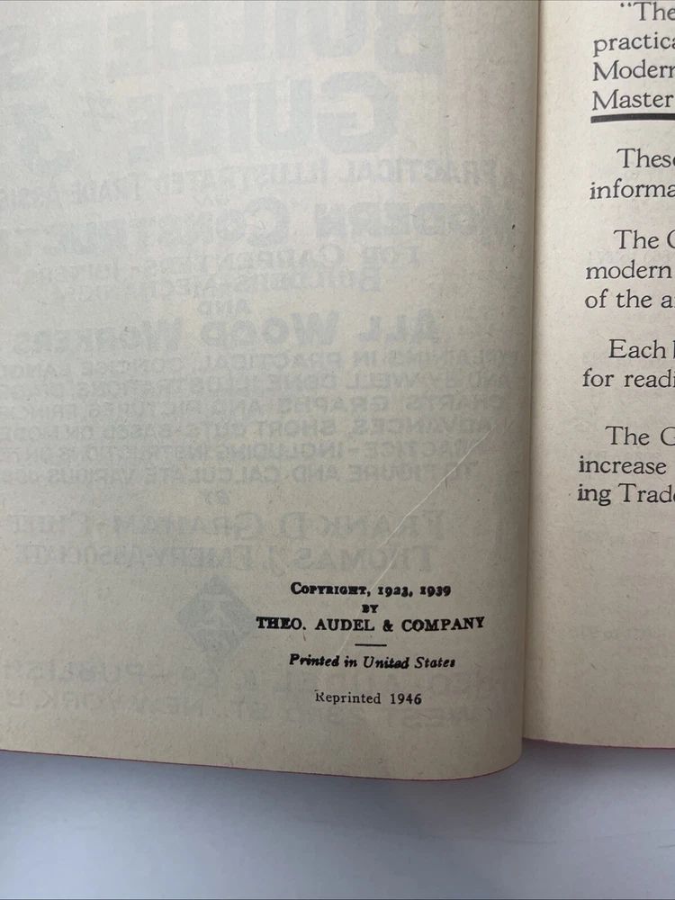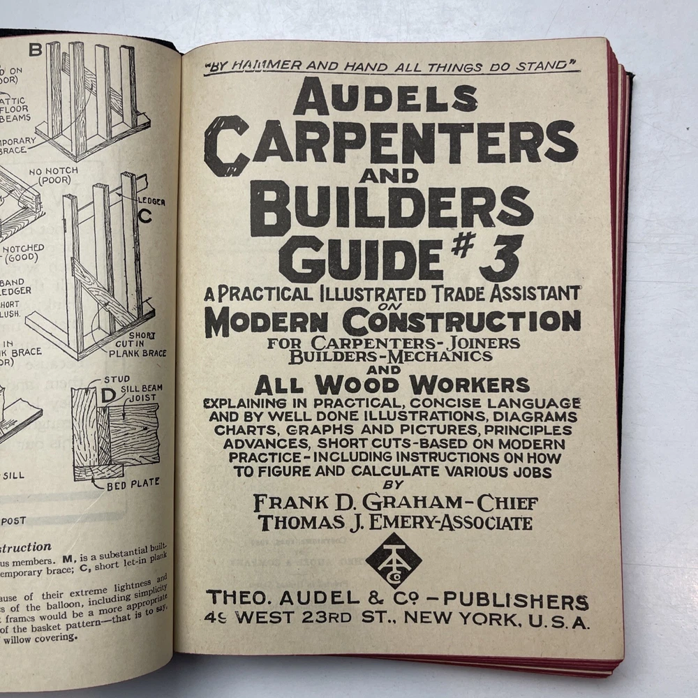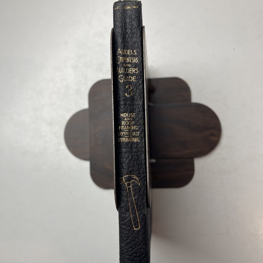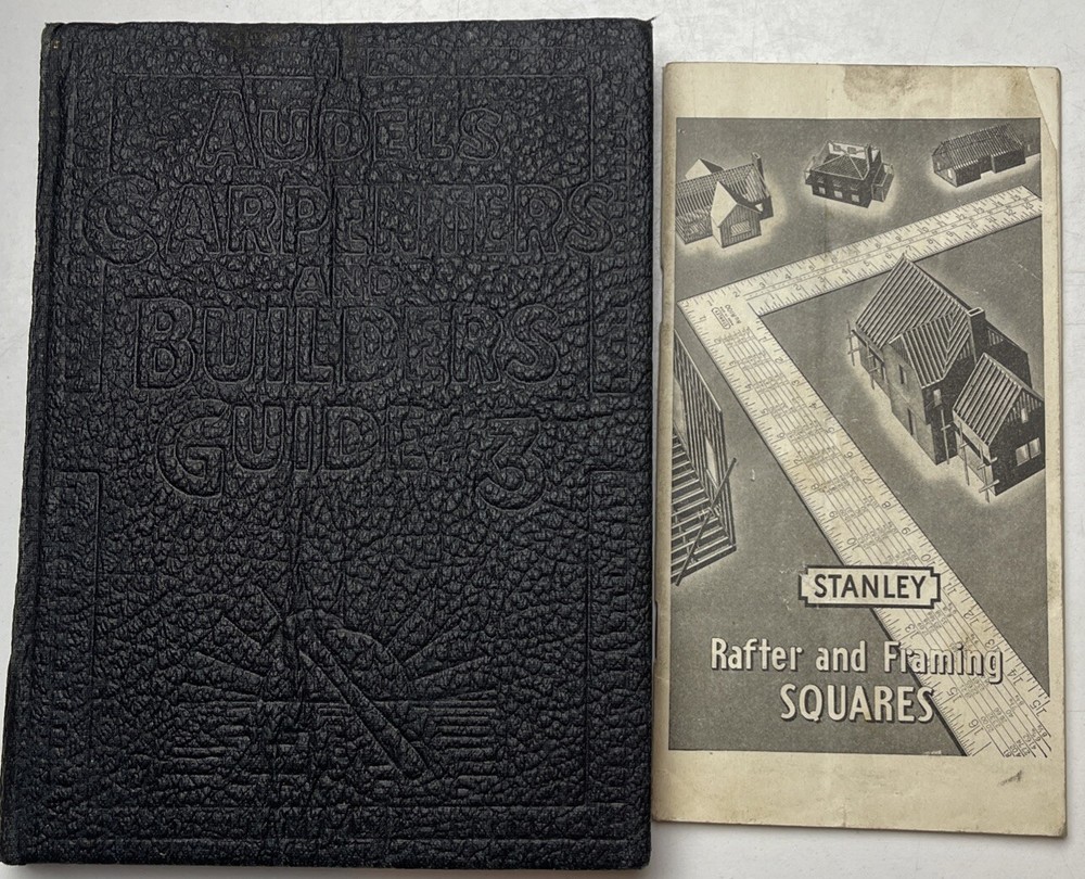 This vintage Audels Carpenters and Builders Guide Book #3 is a valuable addition to any collection of antique building and construction literature. The leather bound book, published in 1946 by Theo. Audel & Co. in New York, contains a wealth of information on carpentry and building techniques. Plus Stanley squares.
