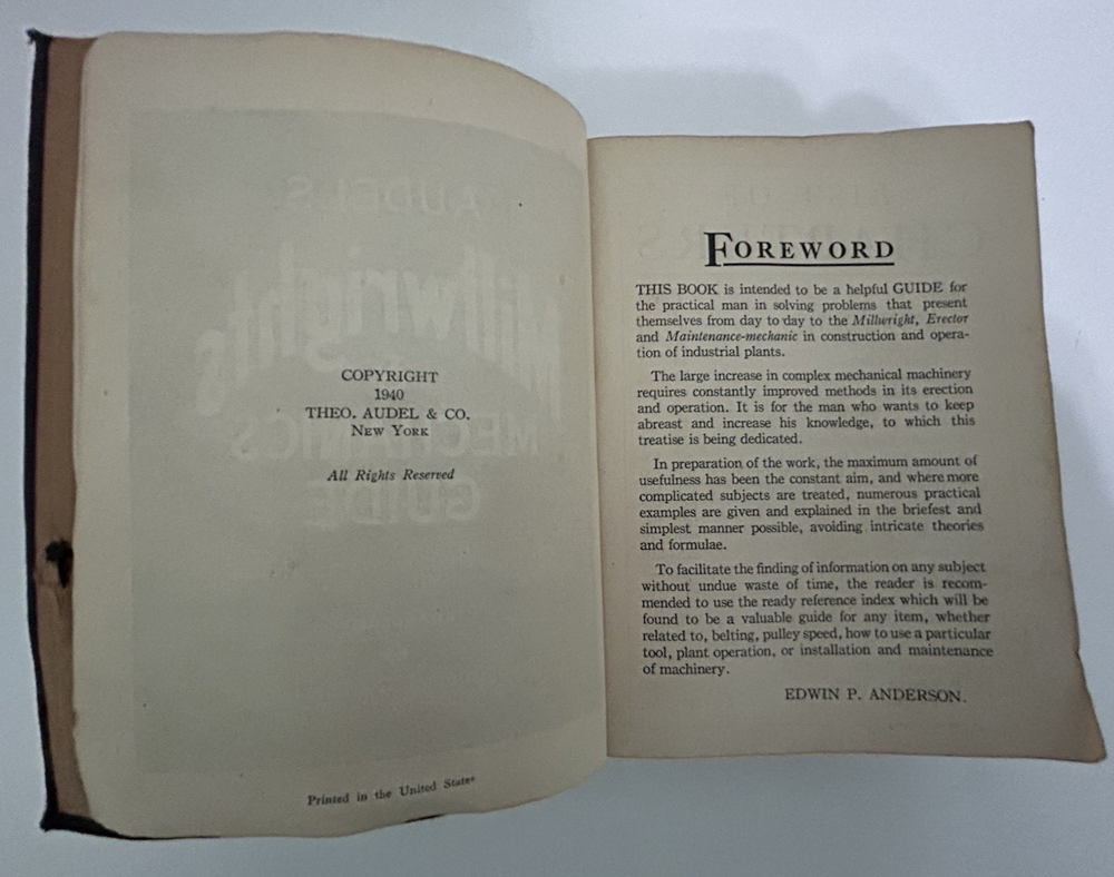Audels Millwrights & Mechanics Guide for Plant Maintainers, Builders, Riggers, Erectors, Operators, Construction Men, and Engineers. author: Edwin P. Anderson Leather bound copy. Printed in USA