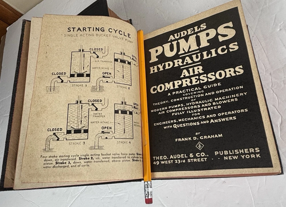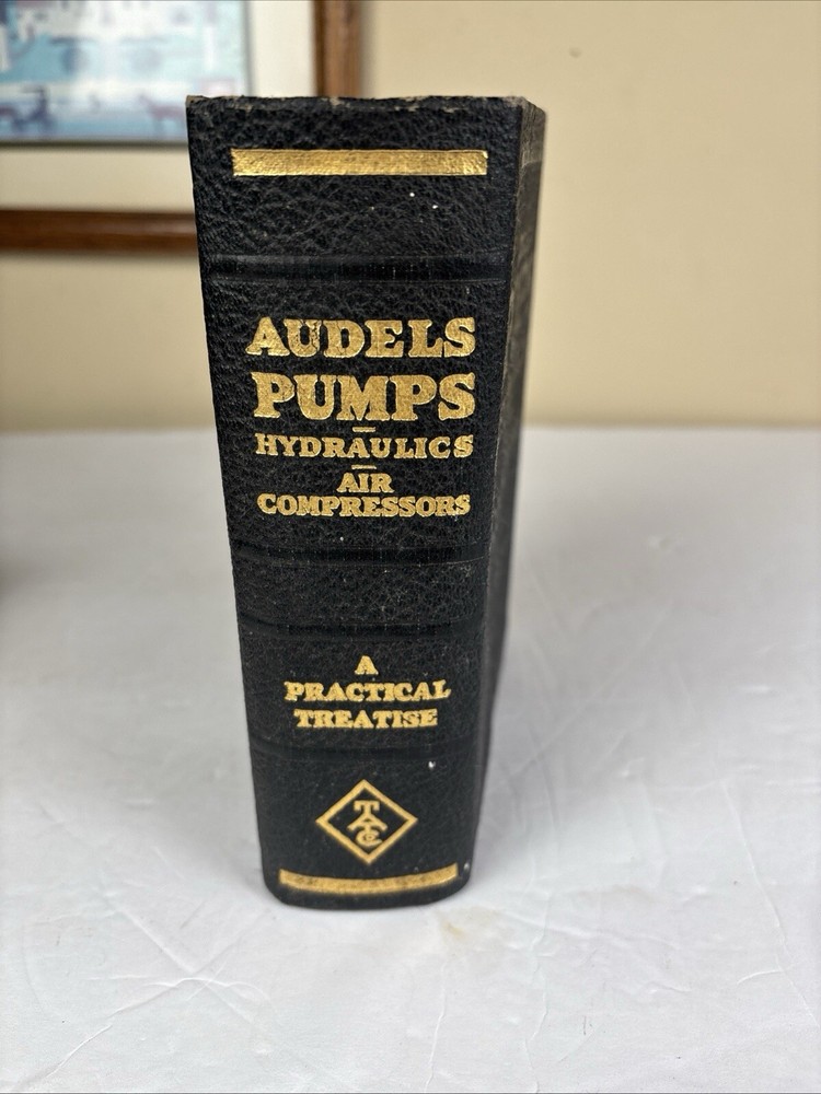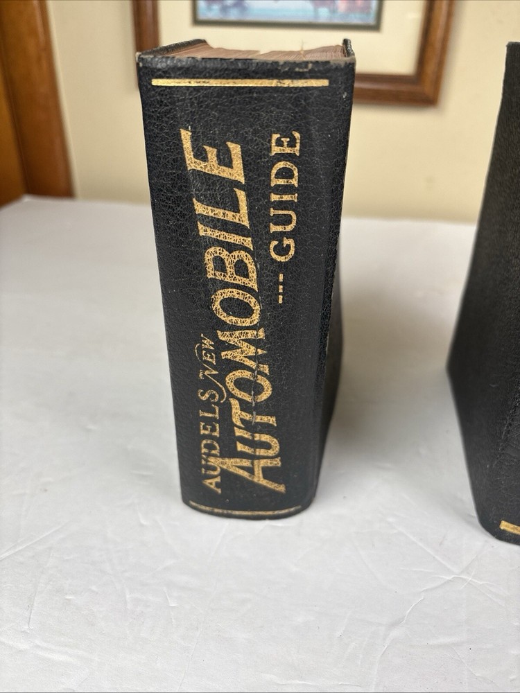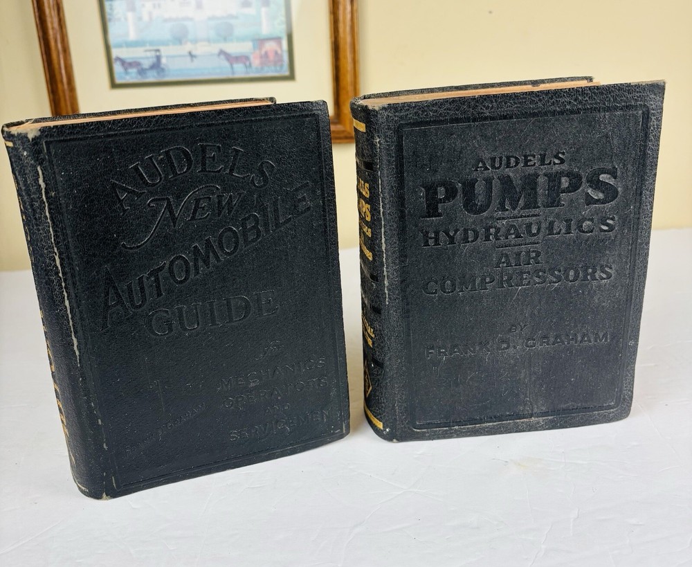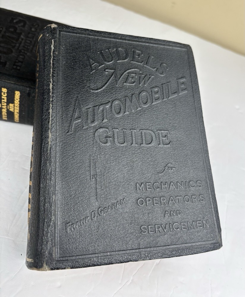 Audels New Automobile Guide For Mechanics, Operators, Service Men 1938 (reprinted 1947) 1067 pages - Frank Graham. Audels Pumps Hydraulics, Air Compressors - A practical Treatise 1943 (reprinted 1943) 406 pages. Normal antique age wear. The automobile guide has a faint name on inside page. No notations, torn or missing pages. Inside paper binding cover of the automobile guide has become partially unglued. These are nice. Please feel free to ask any questions or to request more photos.