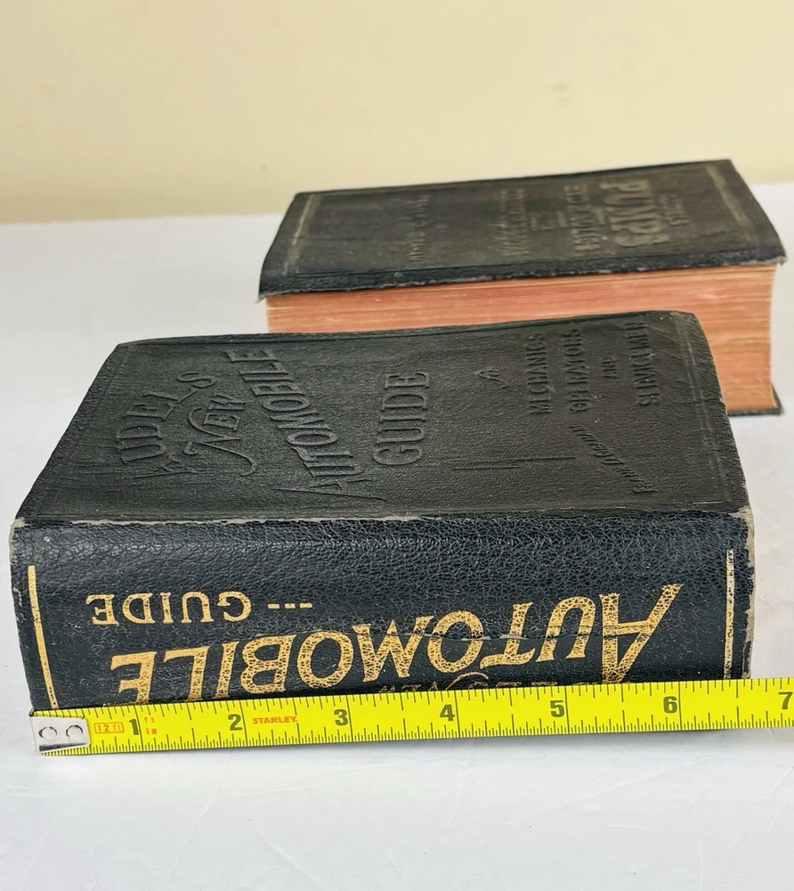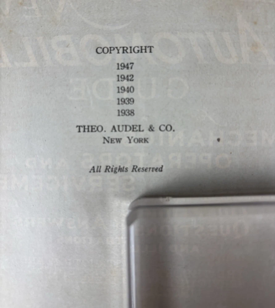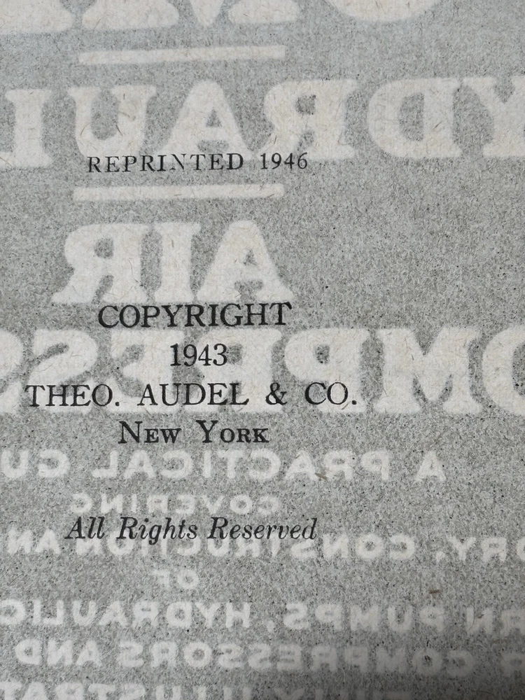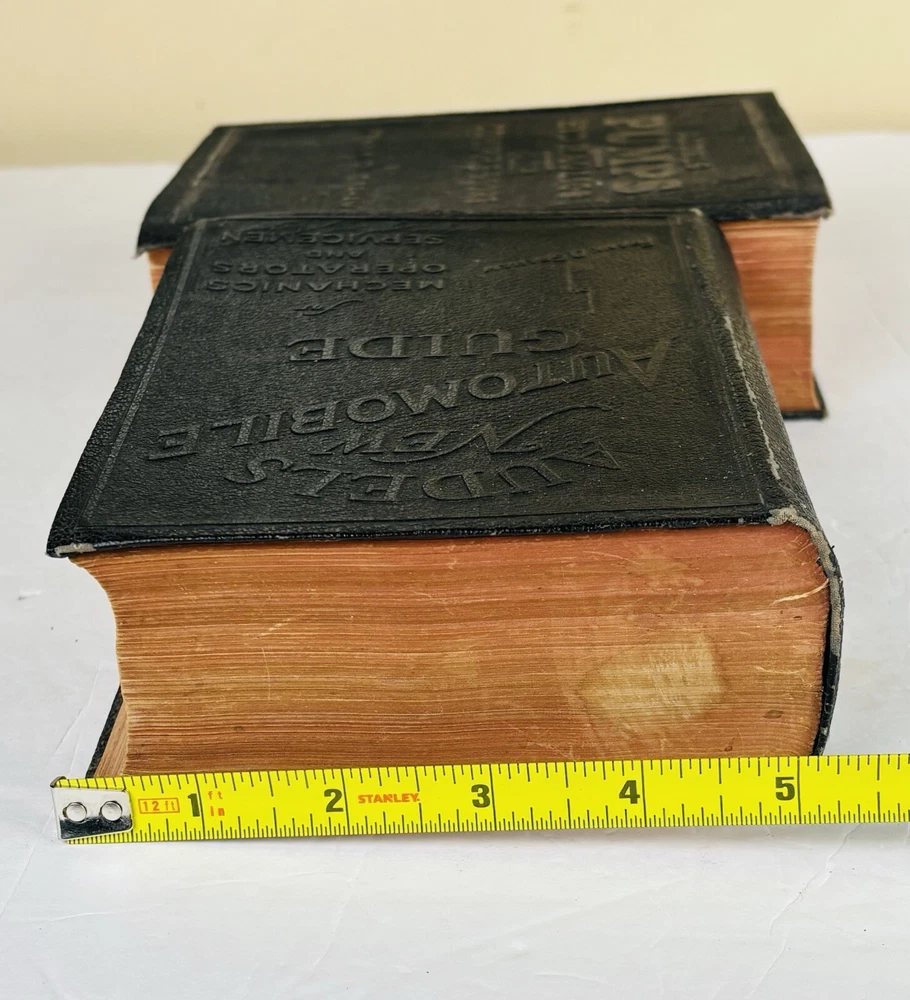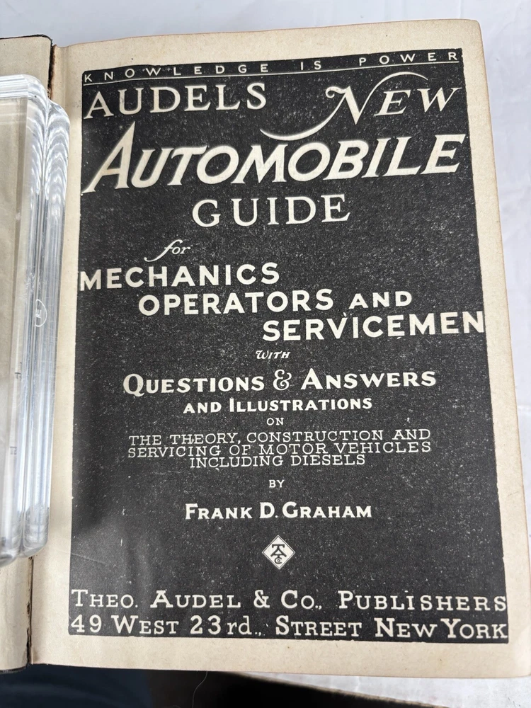 Audels New Automobile Guide For Mechanics, Operators, Service Men 1938 (reprinted 1947) 1067 pages - Frank Graham. Audels Pumps Hydraulics, Air Compressors - A practical Treatise 1943 (reprinted 1943) 406 pages. Normal antique age wear. The automobile guide has a faint name on inside page. No notations, torn or missing pages. Inside paper binding cover of the automobile guide has become partially unglued. These are nice. Please feel free to ask any questions or to request more photos.