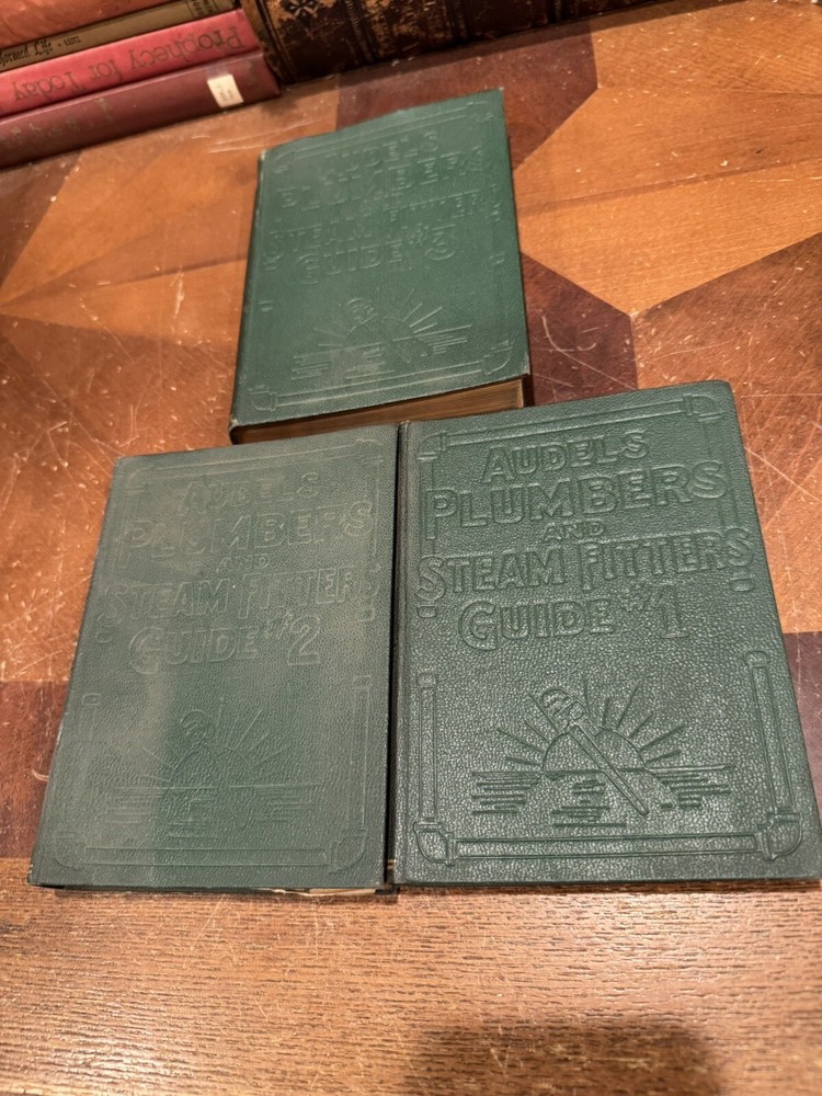 This is a set of three books titled "Audels Plumbers and Steam Fitters Guides 1, 2, & 3." The books were originally published in 1925 and later reprinted between 1944-1948 in New York, USA by Theo. Audel & Co. They are authored by Frank D. Graham and focus on the subjects of Plumbing & Steam Fitting. The books are in English, illustrated, and are considered original editions.