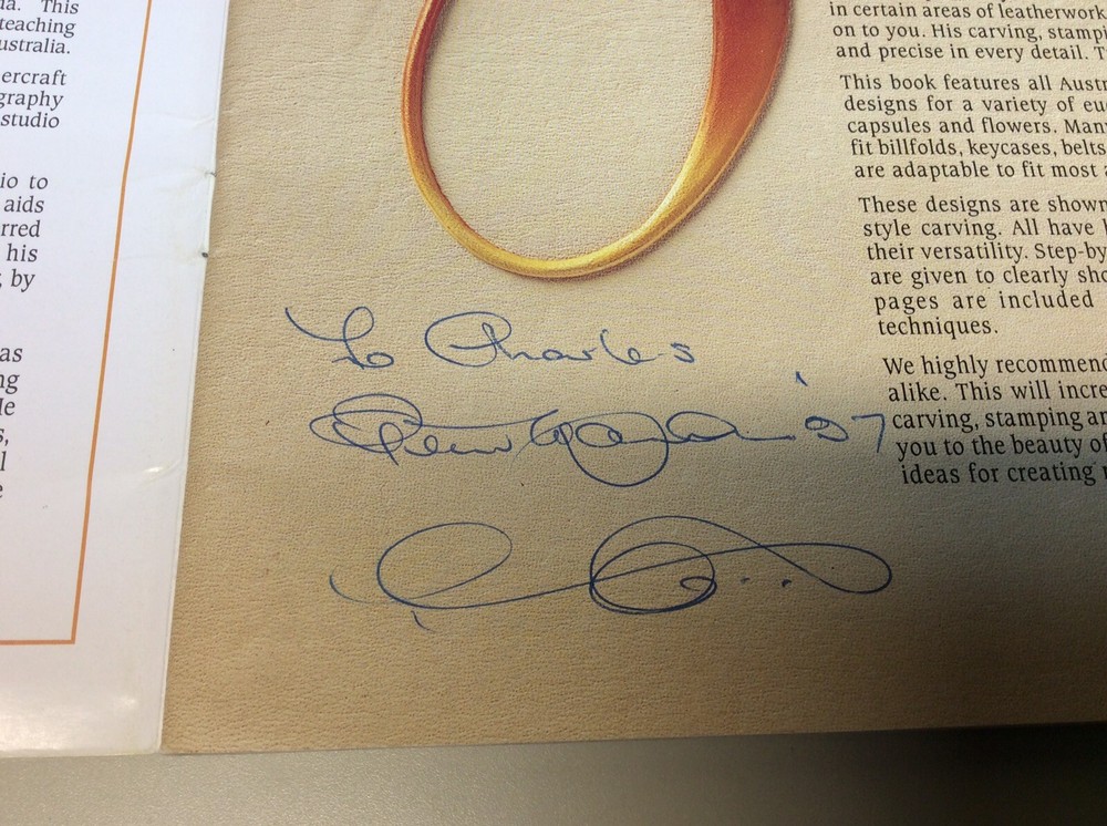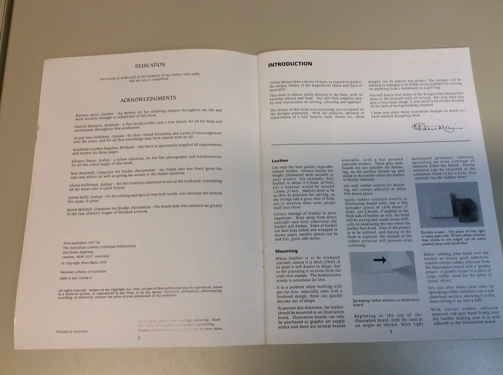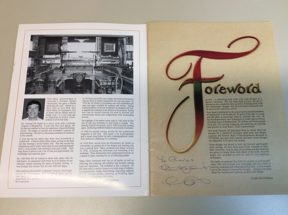 Australian Leather Leather Carving Signed Autographed by Peter Main Copyright 1997. 47 pages (40 color pages). Condition is "Very Good". Shipped with USPS Media Mail....