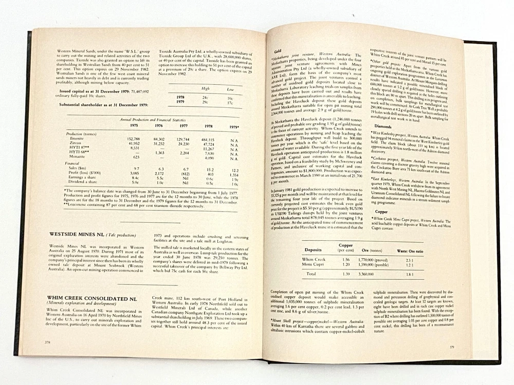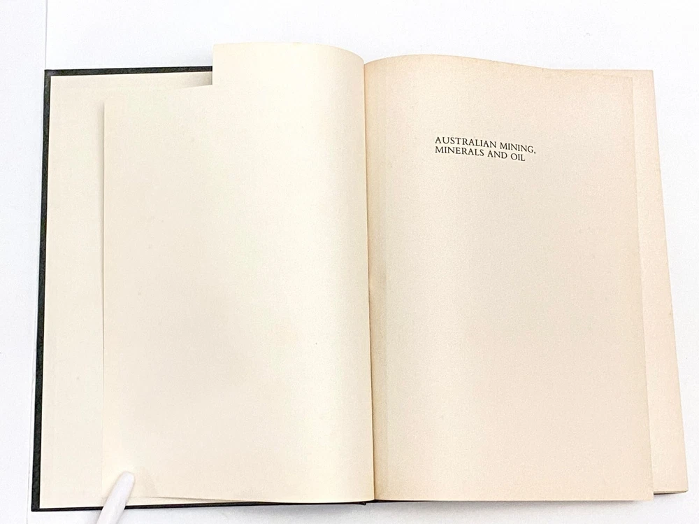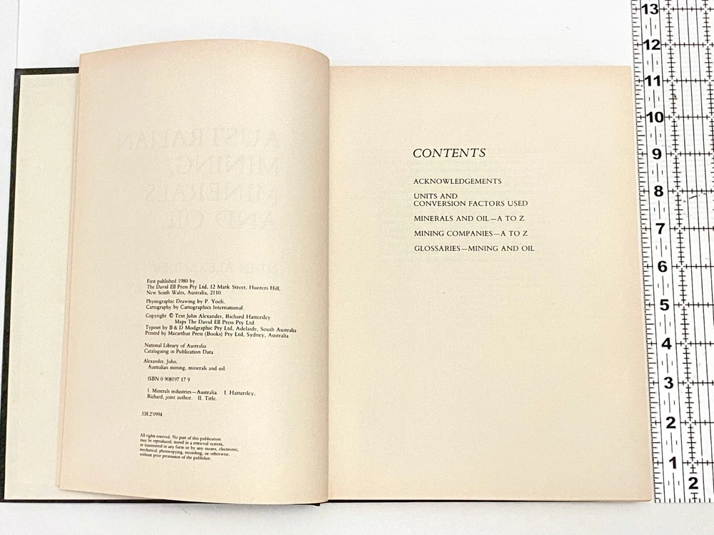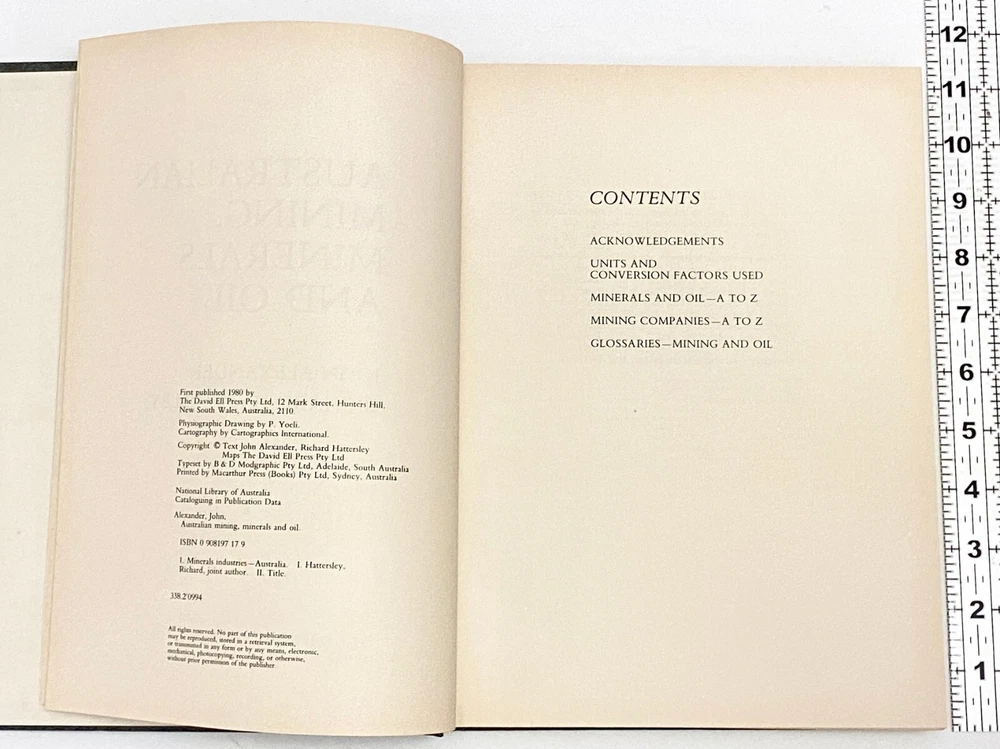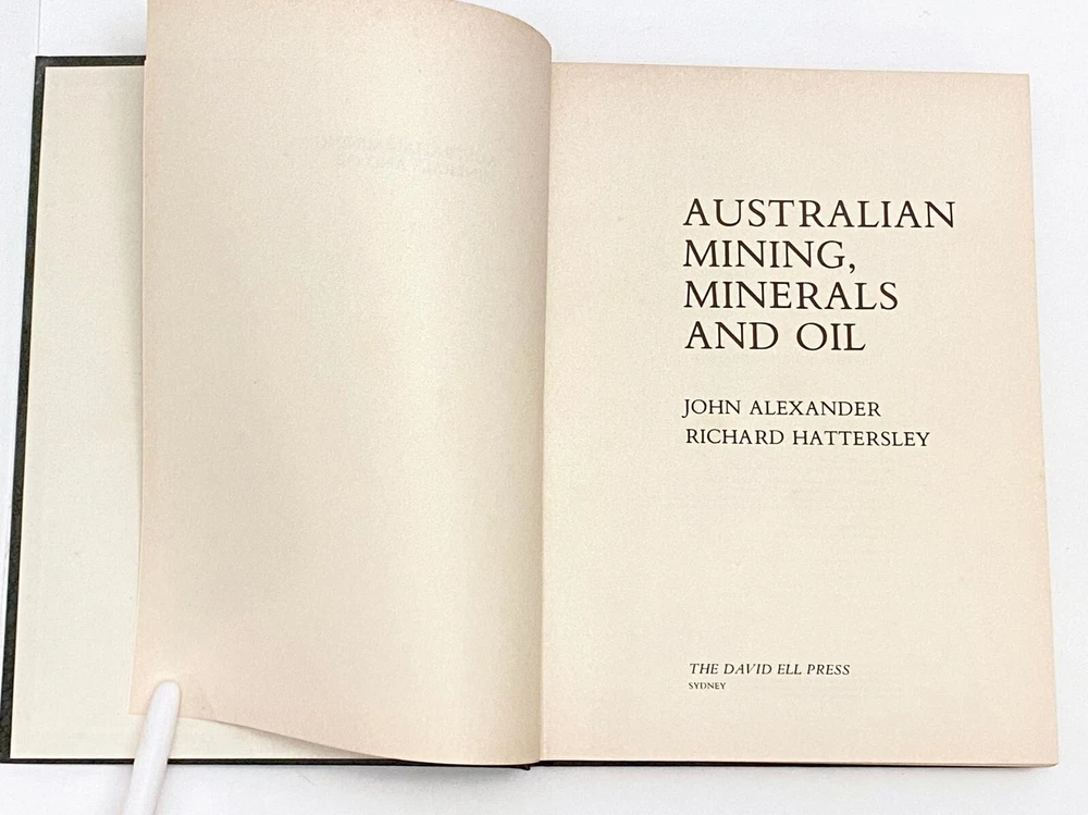 Australian Mining, Minerals and Oil by John Alexander and Richard Hattersley HB 1980 The book is in good condition. The book has creases, scratches, and marks on its front, spine, and back. The book has marks on its page edges. The pages have tanned due to age. The first blank page has the upper right hand corner cut off and a number with an arrow written on it. Please see pictures. This book will be sent via USPS Media Mail.