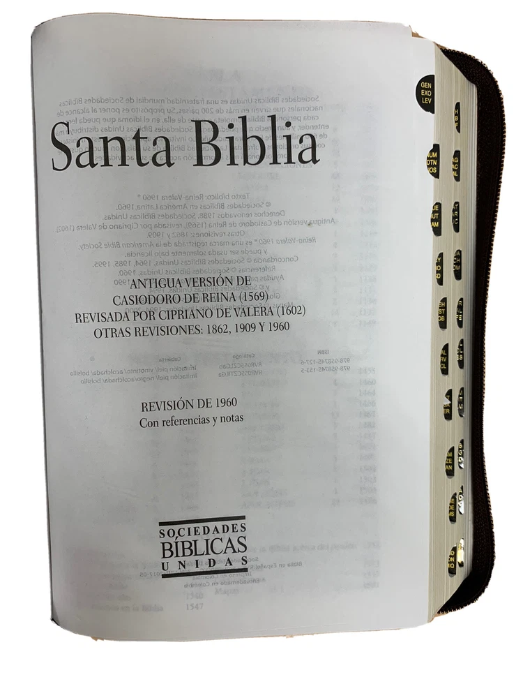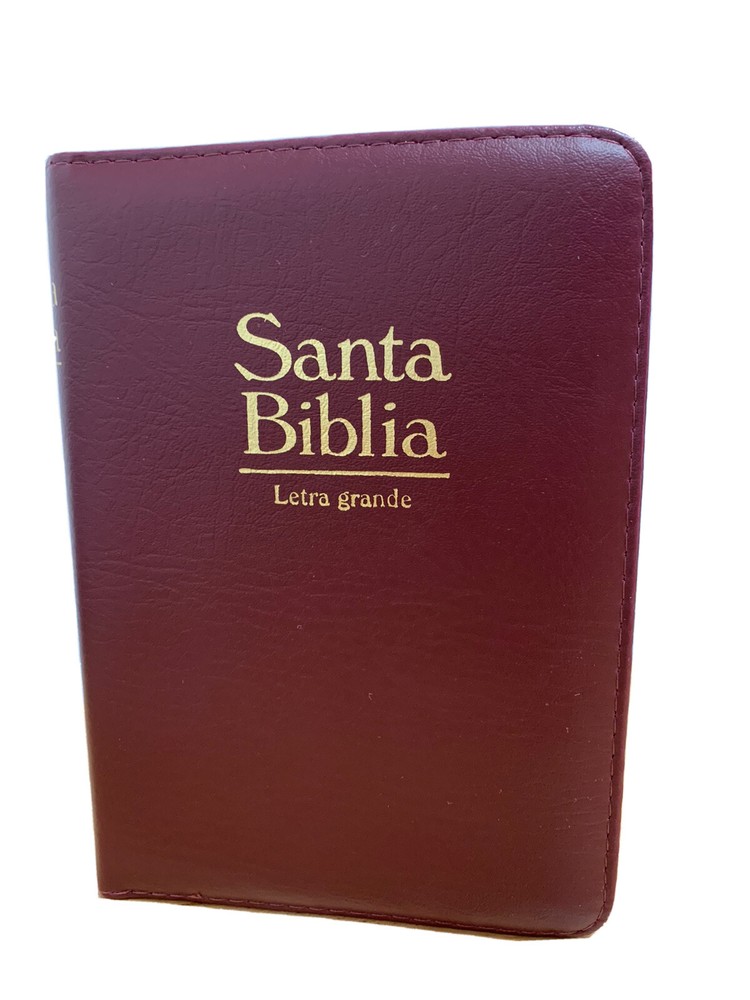 BIBLIA TAMANO MANUAL ACOLCHONADA LETRA GRANDE CIERRE INDICE. Esta preciosa Biblia tiene una presentacion muy especial. Reina Valera 1960, viene en imitacion piel color negra, con cierre y cartera trasera con broche . Características: Página de presentación, Ayudas para el lector, Referencias al final de los versículos, Tabla de pesos y medidas, Un pequeño glosario, Cinta marcadora, Plan de lecturas diarias, Lista de lecturas selectas, Mapas de tierras bíblicas en blanco y negro, El tamaño de letra aproximadamente 12 puntos y el diseño de la página en dos columnas, facilita su lectura. Tamaño 8 x 5 in ( pulgadas) NOTA ESTA BIBLIA NO VIENE CON PALABRAS DE JESUS EN ROJO