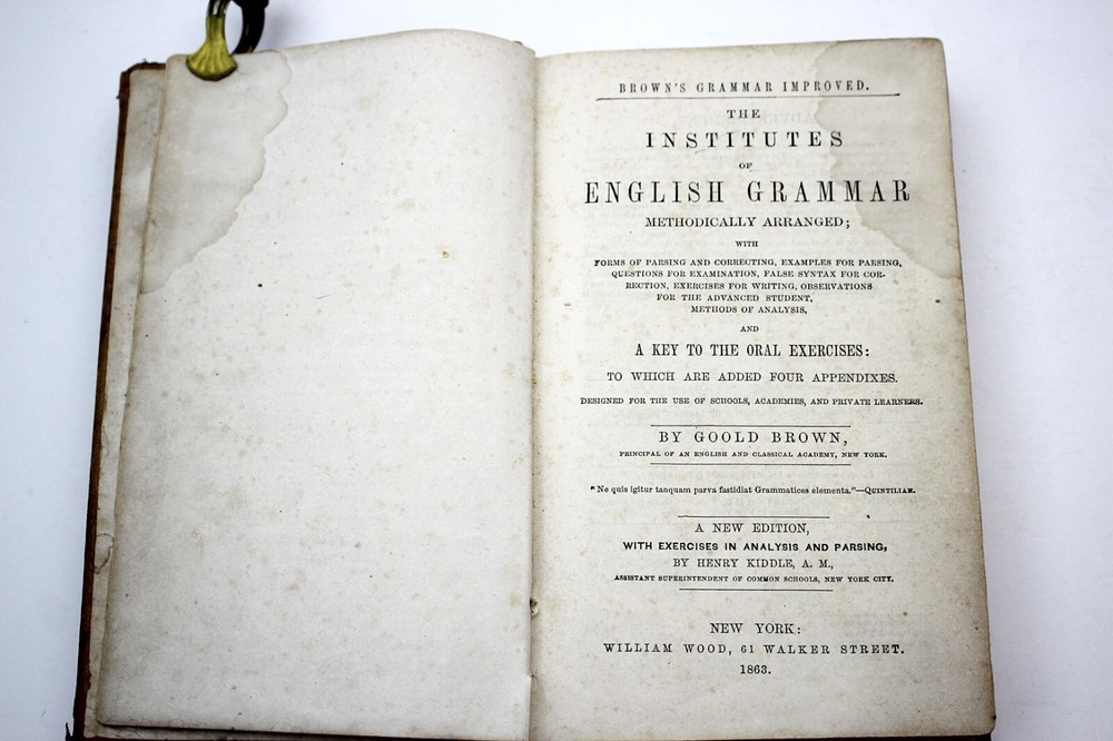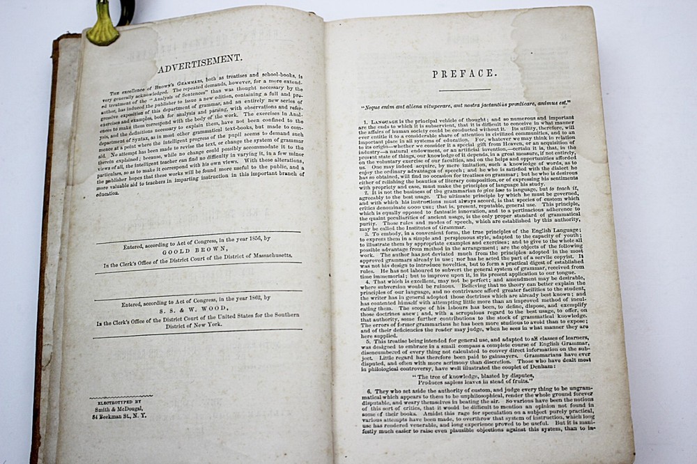 BROWNS GRAMMAR Goold Brown 1863 Leather Binding New Edition New York Printing Decent condition for its age. Typical wear to pages and covers. Small 8vo. See photos for condition description. Pictures are of the actual item(s) you will receive. 10 422 Case 4, 2