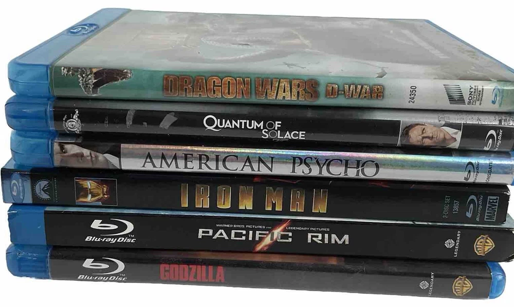 Experience the ultimate movie night with this amazing Bundle of SIX different Blu-Ray discs. Featuring blockbuster hits such as Godzilla, Pacific Rim, Dragon Wars, Quantum of Solace, Iron Man, and American Psycho, this bundle has something for everyone. Enjoy the widescreen or full format of each movie, along with multiple disc sets and special features that provide a truly immersive experience. Indulge in the world of science fiction and action with this incredible Blu-Ray bundle, perfect for movie lovers of all ages. From the thrilling battles of giant monsters in Godzilla to the epic robot fights in Pacific Rim, this bundle is sure to keep you on the edge of your seat. Iron Man: 2 discs with special features & user guide. Cardboard Sleeve. Very good. Dragon Wars: Single Disc. Artwork and Disc are very good but case plastic has imperfection. American Psycho: Single Disc. Case, Artwork ,Disc are in very good condition. Quantum of Solace: Single Disc. Special Features, Widescreen. Disc, case, artwork is in very good condition. Pacific Rim: 2 discs with special features. Blu- Ray + DVD + Digital HD Ultraviolet. Cardboard sleeve. Case, cardboard sleeve, disc in very good condition. Godzilla: 2 discs with special features. Case, artwork and both discs are in very good condition.