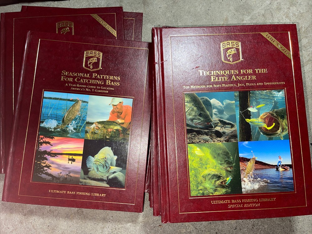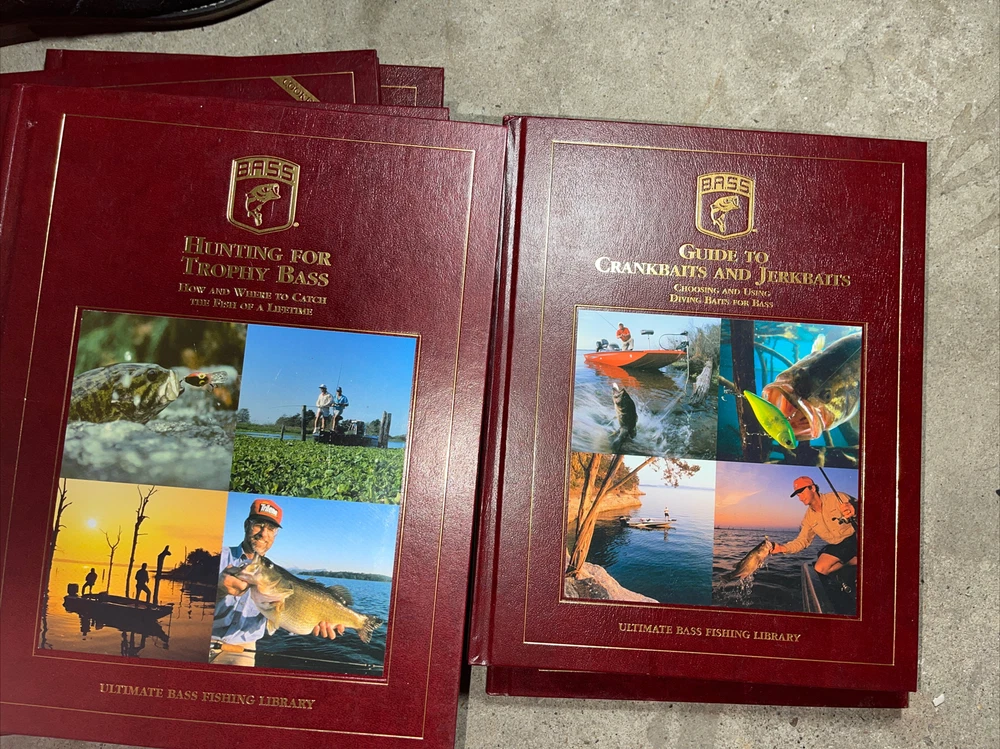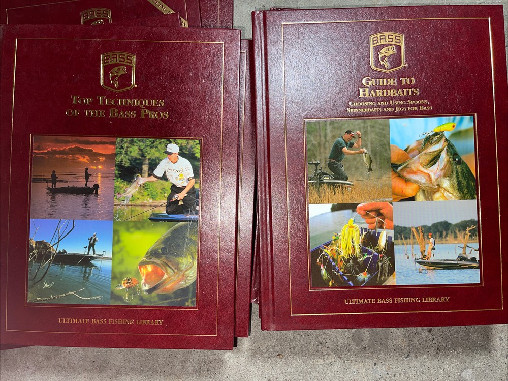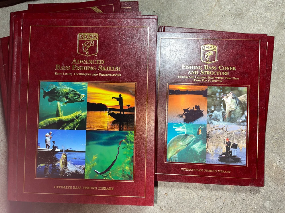 Bass Ultimate Fishing Library 10 Volumes Hardcover Leather Bound Books (NEW) HB. 2003 edition 10 volumes as follows: Fishing bass cover & structure Guide to crankbaits & Jerkbaits Advanced bass fishing skills Hunting for trophy bass Guide to hardbaits Top techniques of the Bass Pros Techniques for the elite angler Seasonal patterns for catching bass Americas favorite fish recipes Guide to topwater fishing Shipping via priority mail or UPS whichever will be most economical