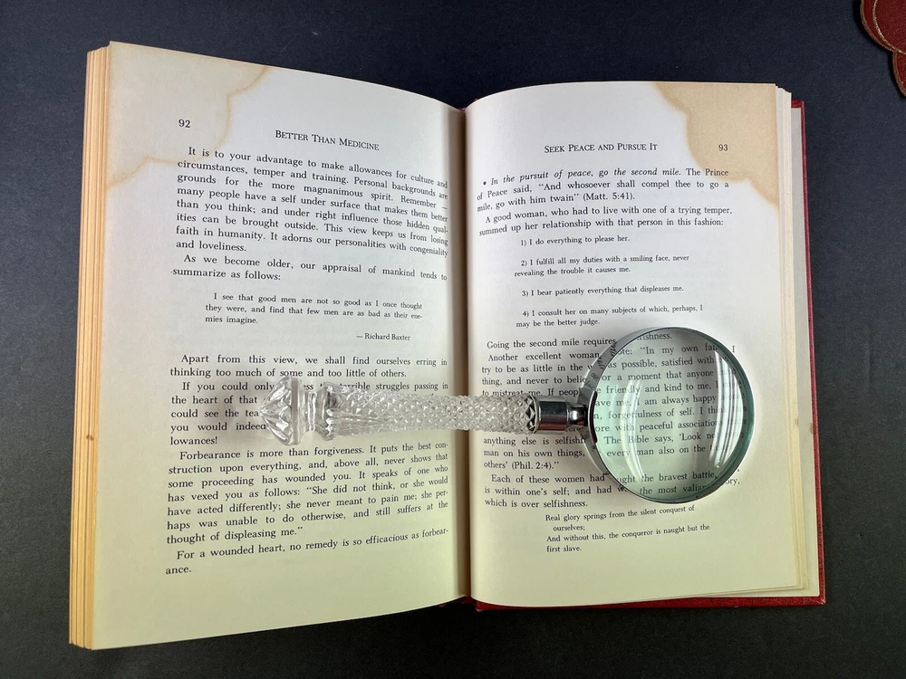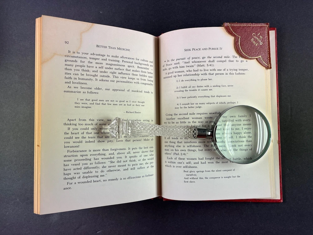 This beautiful faux leather hardcover is a joy to hold—rich red with gold accents, quality paper, and clear text. The handwritten inscription adds a personal touch, and the included leather bookmark is a nice bonus. Though there’s slight toning where the bookmark rested, it only adds character. A lovely, uplifting read that feels special in every way!