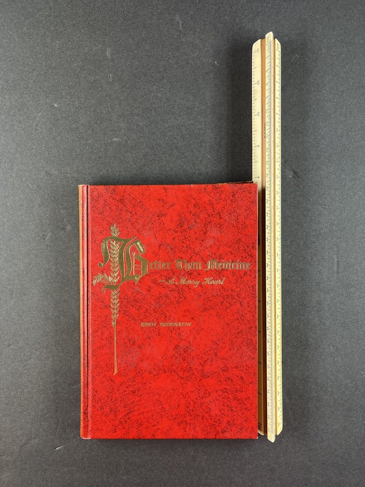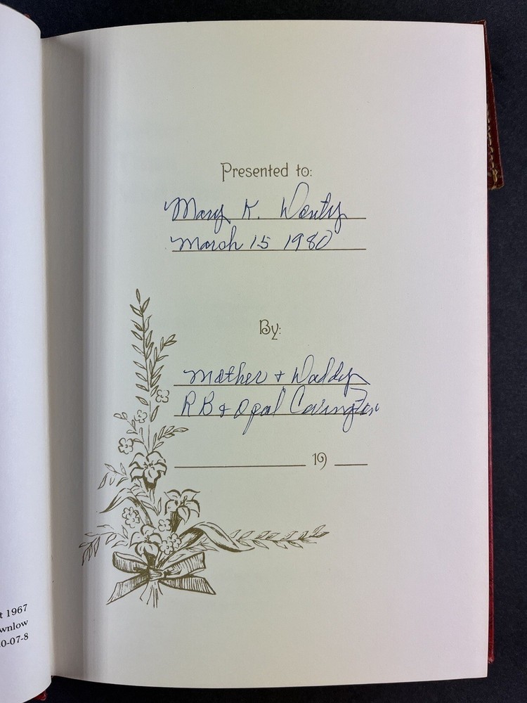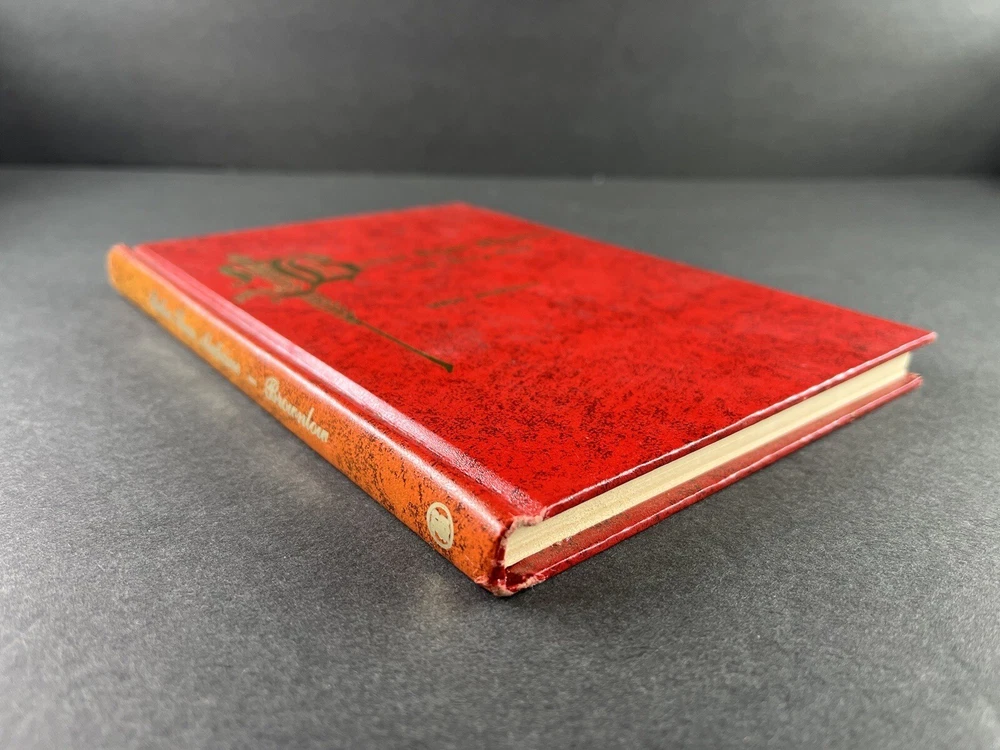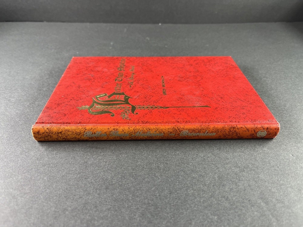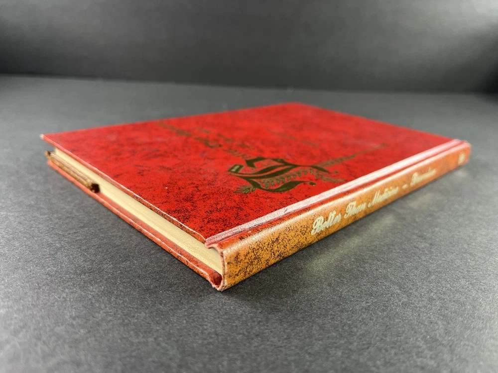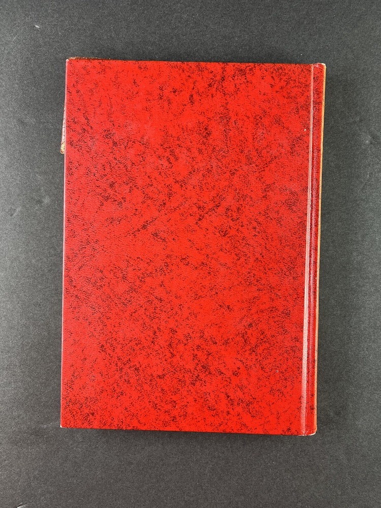Hardcover bound in faux red leather with gilt title to front board and spine. Nice paper, nice text. There is a hand penned inscription to the presenting page. Included is a leather bookmark. There is toning/staining to the top edge of page 92-96 where the book mark has maintained the place for some time.