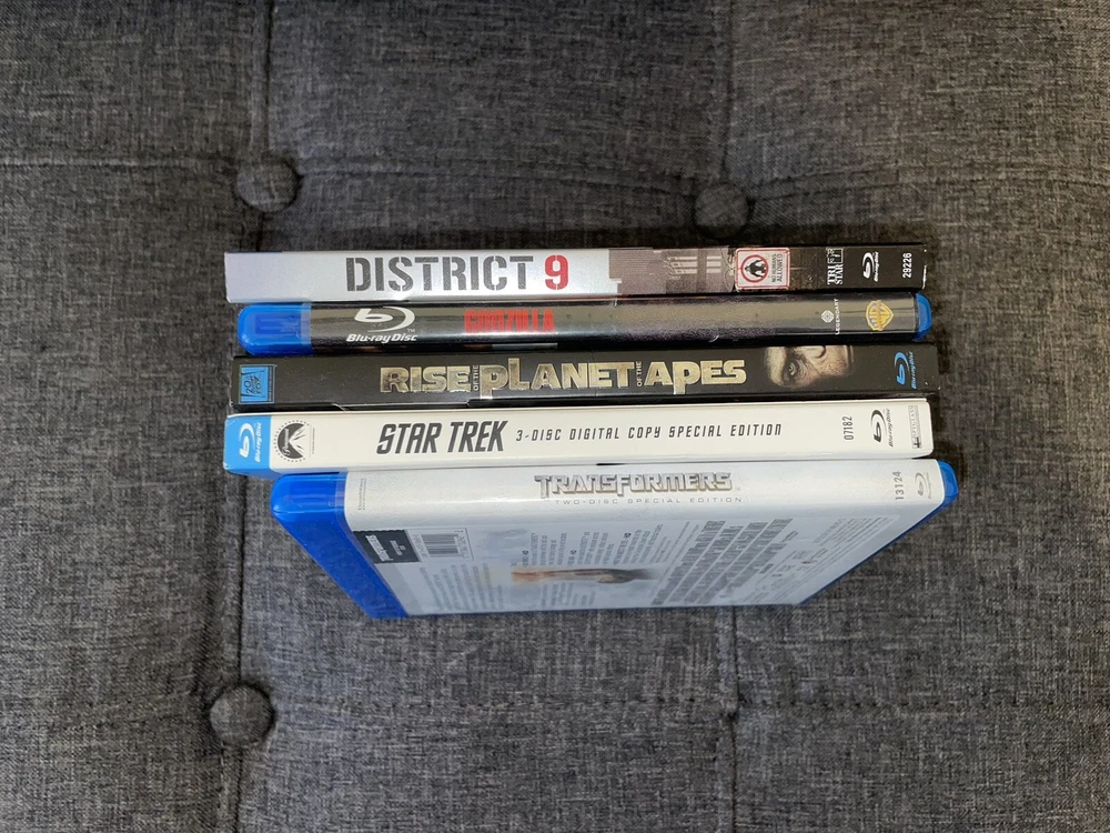Science Fiction Blu-Ray Movies Set Lot. These are all sci-fi movies that are great for their story and special effects. These are all from my personal collection and are in great shape. These were all bough from a store and are not former rentals. All Blu-rays are Region A, USA. These sets do not include digital copies. The five movies included are: District 9 on Blu-Ray and includes digital DVD disc but no code included (Slipcover Included) Godzilla 1, on Blu-Ray & DVD Rise of the Planet of the Apes 1, on Blu-Ray & DVD which is also the digital copy disc but no code included (Slipcover Included) Star Trek 1, 3-Disc Special Edition Blu-Ray, DVD & DVD digital copy disc but no code included (Slipcover Included) Transformers 1, Special Edition Two-Disc Blu-Ray set Will ship with USPS.