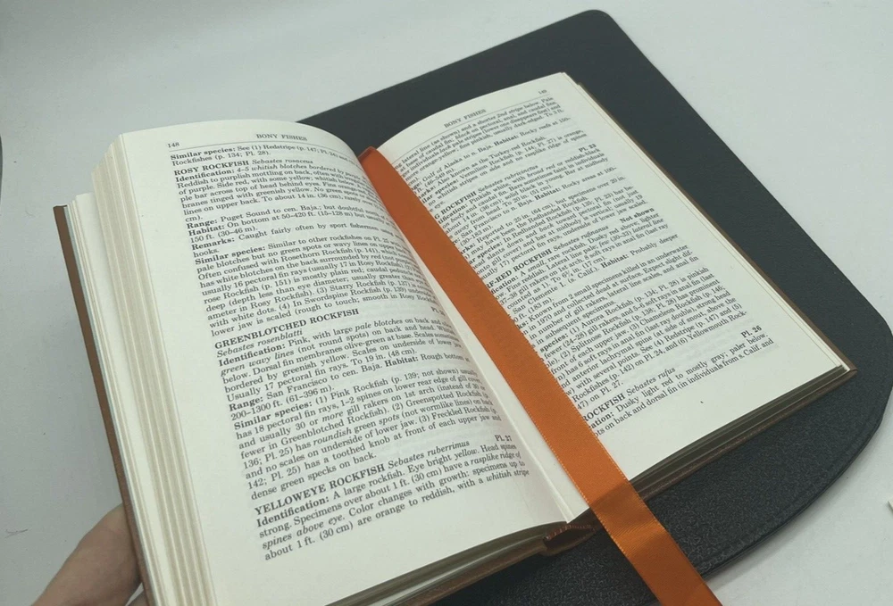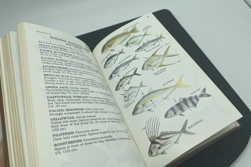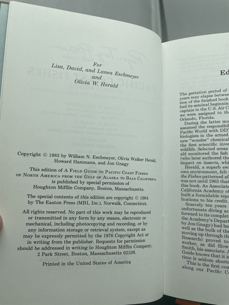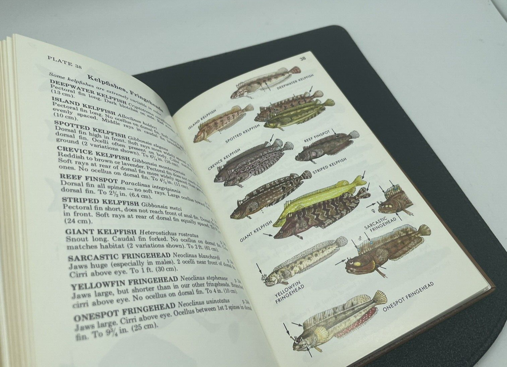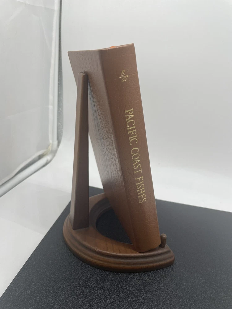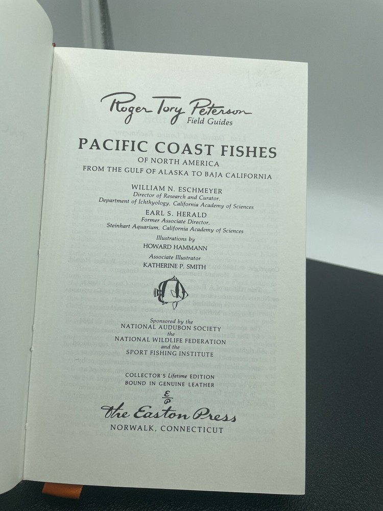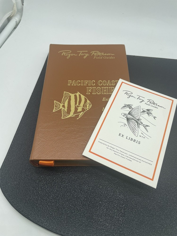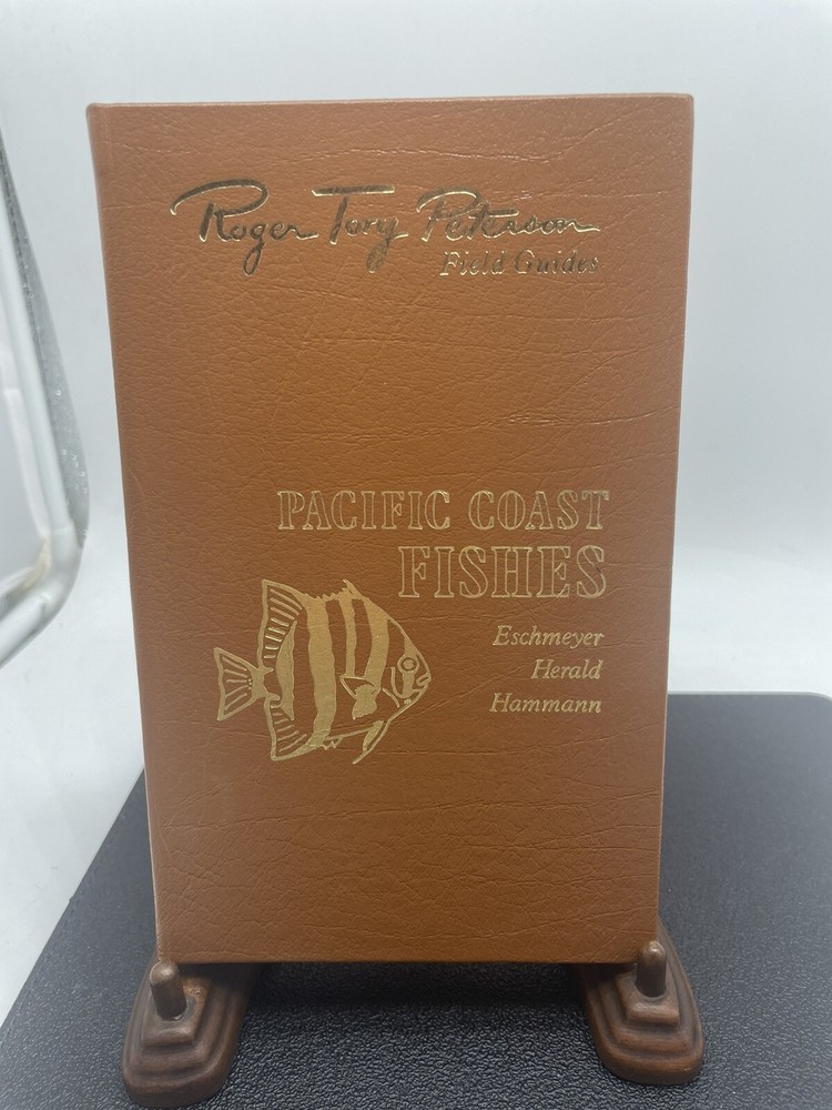 Up for your consideration is the Roger Tory Peterson Field Guides Pacific Coast Fishes guide by William Eschmeyer and Earl S. Herald . See title page for more details. Published in 1983 by the Easton Press. This is the Collector’s Lifetime Edition bound in genuine leather Gold gilt on cover, spine, and page edges. Comes with ribbon placeholder and the original Roger Tory Peterson Field Guides book plate Book measures approximately 4 3/4” x 7 1/2” – 336 pages, illustrated The wood book stand is not included in the listing Condition –The book is in fine condition. Binding is tight, pages are clean throughout, no writing in book. Please see the photos and zoom in for a good look at the condition. Please view all photos as they are intended to be part of the description Please see my other listings in my shop, The Looney Bin Shop, for more interesting books and vintage items. There are two other Roger Tory Peterson field guides listed and I will combine shipping I will ship your item media rate within one business day of payment, with tracking, and will pack with great care. Any questions just send me an email Thanks for looking!