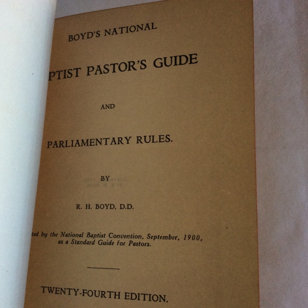 This antique book is a treasure for collectors and enthusiasts of religious literature. Written by Boyd and published by the National Baptist Publishing Board, it contains valuable guidance for pastors on parliamentary rules and procedures. Gently used. Original owner’s names on front and back inside covers. Age related toning