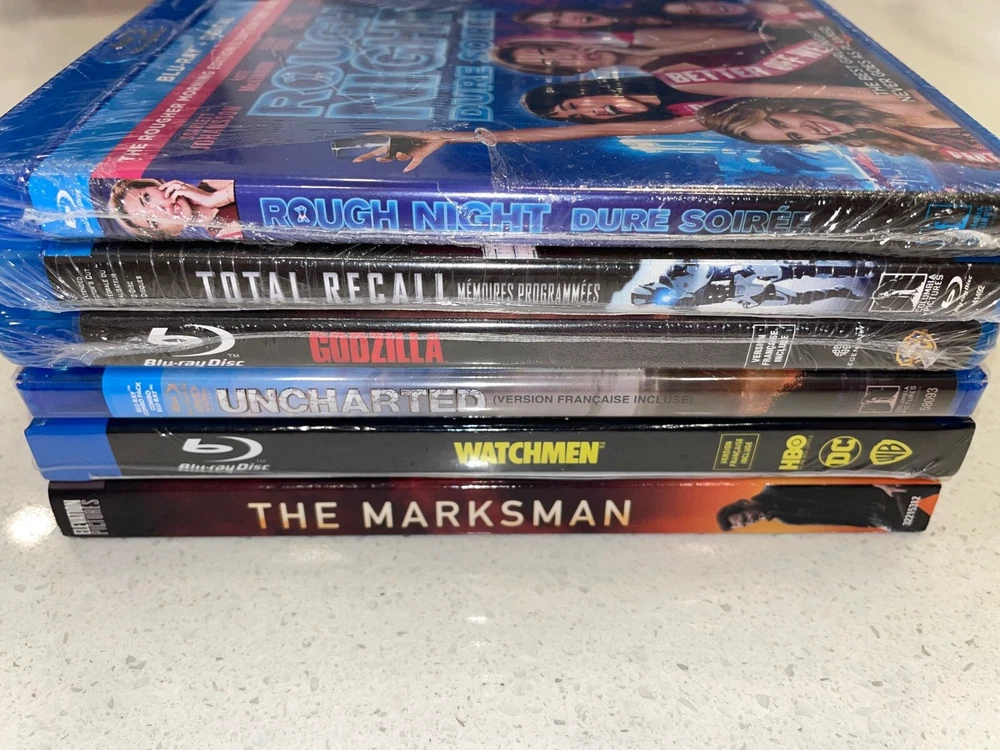 Brand new factory sealed Blu-Ray Movies The Marksman (Blu-ray + Digital) Uncharted (Blu-ray + DVD) Watchmen (Blu-ray) Total Recall (Blu-ray + Digital) Godzilla (Blu-ray) Rough Night (Blu-ray + Digital) 100% original, not a copy