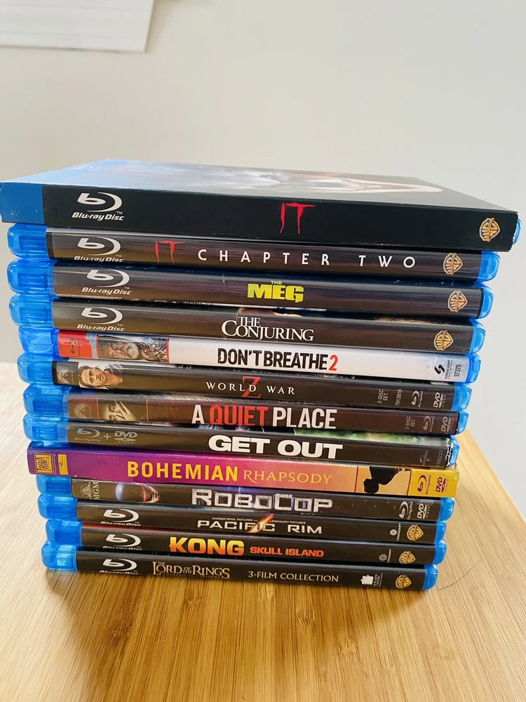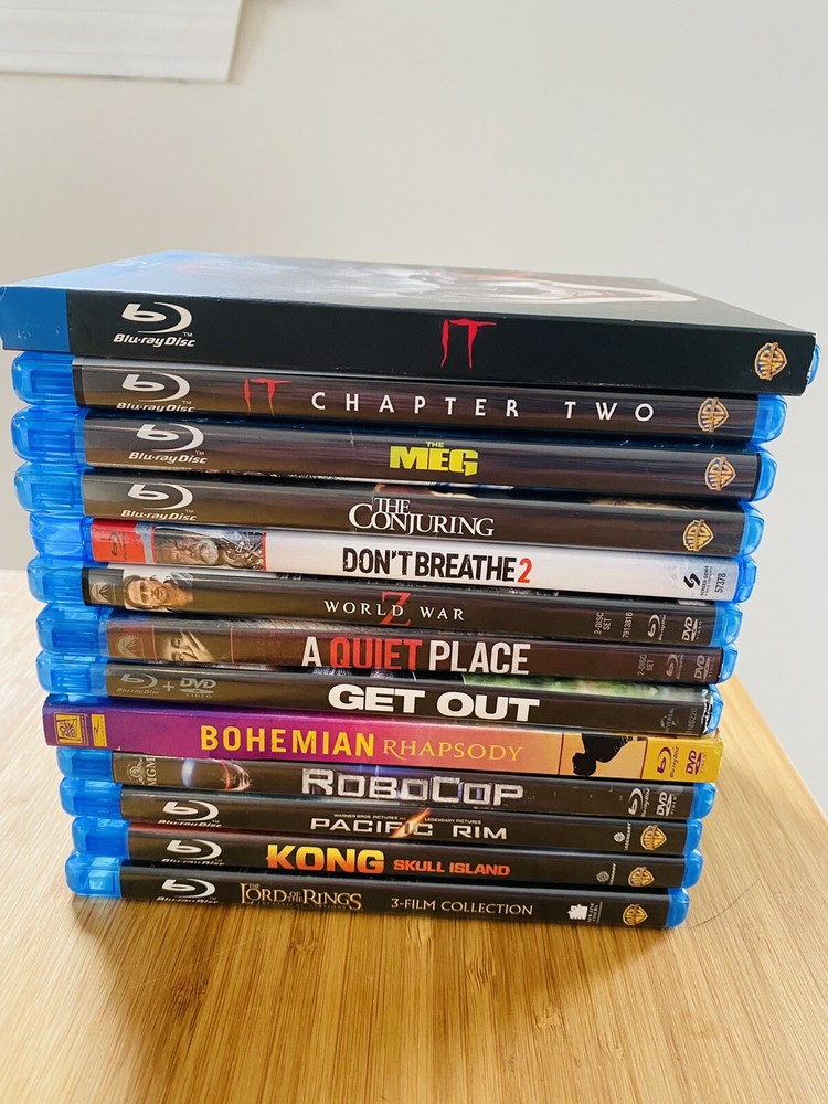 blu ray lot. horror and action movies A quiet place Annabelle Comes Home Annabelle Creation Bohemian Rhapsody w/slipcover the Cabin in the woods the CONJURING Die hard w/slipcover Don't breathe 2 Get Out Godzilla w/slipcover IT chapter 1 w/slipcover IT chapter 2 Kong Skull island the Lord of the ring the MEG Pacific Rim Robocop Rob Zombie Trilogy World war Z Deadpool w/slipcover DVD Doom- Unrated Extended Edition w/slipcover
