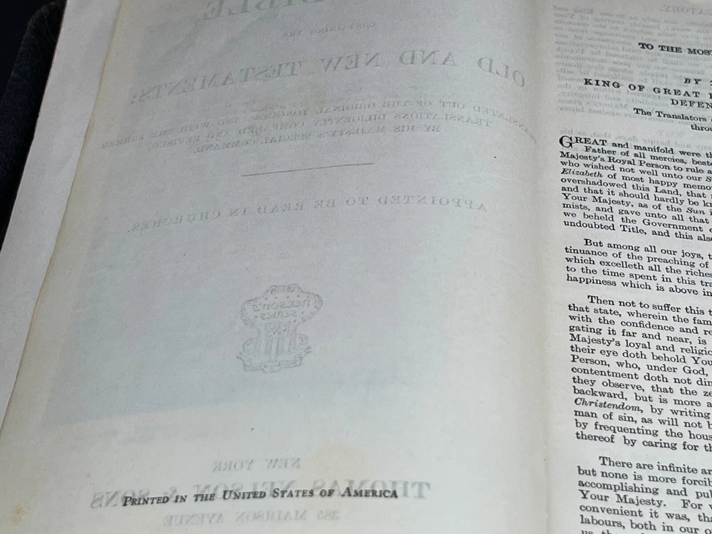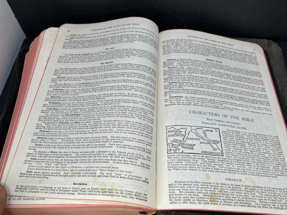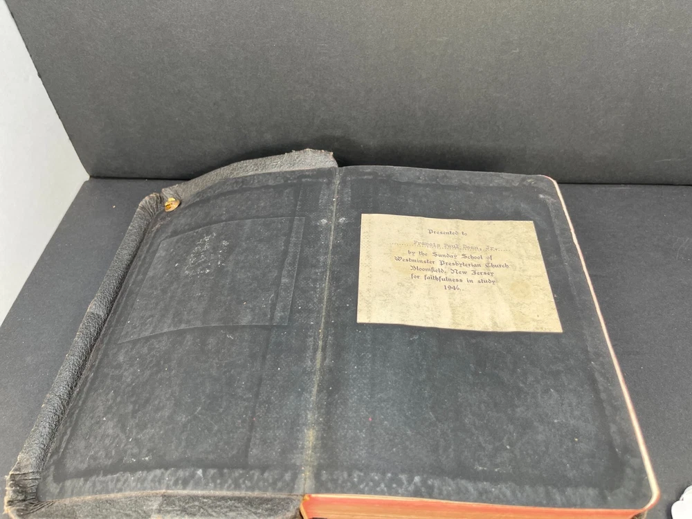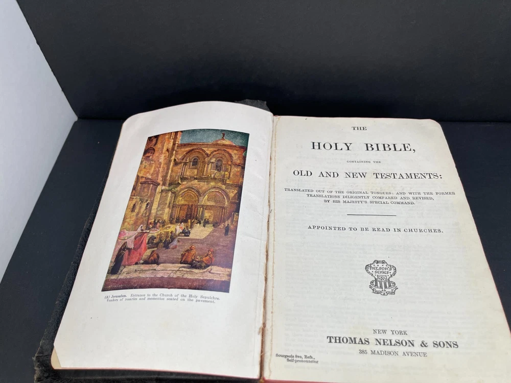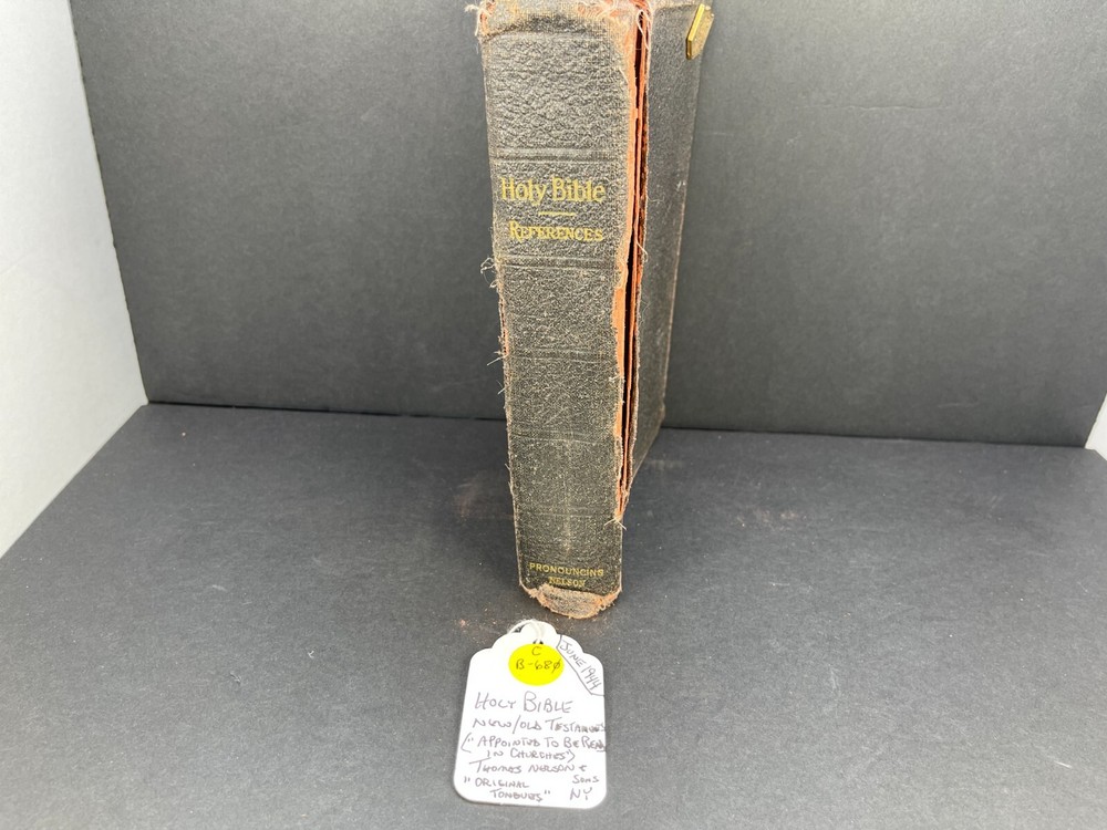 ONE(1) USED ANTIQUE HOLY BIBLE (1920's - 1944 - dedicated 1944) PUBLISHED BY THOMAS NELSON & SONS. THE BIBLE IS TRANSLATED FROM TONGUES WITH OLD AND NEW TESTAMENTS AND MAPS, BOUND IN BLACK LEATHER. THE BIBLE HAS COVER SEPERATIONS AS SEEN IN PICTURES, AND THERE IS SOME SPINE SPERATION.. THERE ARE NO LOOSE PAGES. A WELL USED BIBLE, BUT STILL SOUND AND A NICE WW2 WARTIME BIBLE. PLEASE CHECK OUT MY OTHER SALES, AS I AM SELLING OFF A LARGE BIBLE/ RELIGIOUS PRAYER BOOK COLLECTION!!! I WILL BE ADDING MORE BIBLES UNTIL THE ENTIRE COLLECTION IS POSTED!!! Please see the pictures as completion of the description. We will only accept a return if you did not get the pictured item, or our description is incorrect. PLEASE ASK QUESTIONS BEFORE YOU MAKE A PURCHASE, I REPLY QUICKLY!!! Buy with Confidence, you will get the exact item you see in the sale, and if you have any issues, just check my feedback and rest assured you are purchasing from a long time (25+ years), 100% perfect record EBAY'er. The 1920's - 1944 NELSON & SONS HOLY BIBLE will be well packed and shipped within 1 business days of payment! GOOD LUCK BUYERS!!!