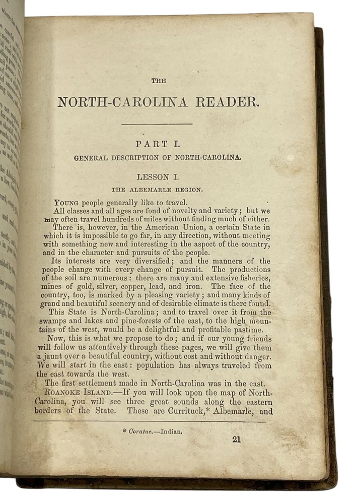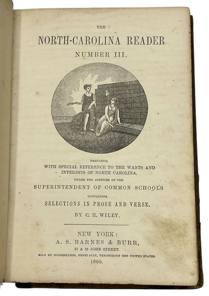 The North-Carolina Reader. Number III. Prepared, With Special Reference to the Wants and Interests of North Carolina Author: WILEY, Calvin H. Title: The North-Carolina Reader. Number III. Prepared, With Special Reference to the Wants and Interests of North Carolina Publication: New York: A.S. Barnes & Burr, 1860 Description: Octavo, 8 x 5.5", original brown cloth with brown morocco spine, gilt spine titles, [2], 6, 3-251 pp. A school textbook for North Carolina students, one of a series of three authored by Calvin H. Wiley, a pioneering North Carolina educator. Wiley was the first superintendent of North Carolina Common Schools, working to reorganize and expand the school such that literacy increased and North Carolina became an education leader among Southern states. The book was first published in 1851; this is the third, revised edition. The reader contains descriptions of the various cities and regions of the state, statistical information, and a series of North Carolina themed essays and poems including "importance of female society in improvement of mind and formation of character" and "advantages of state pride". The text prints statistics regarding enslaved persons in the state, and stresses that that state should be welcoming to farmers of all stripes, including slaveowners. Another section covers a planned July, 1775 slave rebellion, emphasizing the violent intentions of the would-be participants and criticizing their British supporters: "they had been directed to fall, on the night of the 8th, on the white family in which they resided; and after destroying it, to set fire to the buildings, and proceed thus from plantation to plantation...This plan agrees with that suggested by the celebrated Samuel Johnson, a distinguished English critic, but a hateful bigot and uniform defender of tyranny." Seven in OCLC for this 1860 edition. A good copy with toning and foxing, occasional damp staining to pages, wear to covers with chip to lower spine leather. Seller ID: 12904 Subject: Southern Caroliniana Rare Books Antiquarian and collectible books, primitives and antiques. Terms All orders ship within two business days. All items are guaranteed to be as described or they may be returned within 30 days of receipt for a full refund. This listing was created by Bibliopolis.