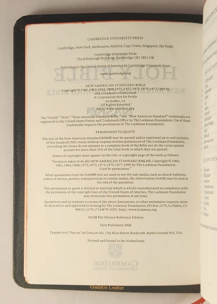 A brand new edition of the renowned New American Standard Bible, reflecting the best traditions of Cambridge Bible typography and production values. Cambridge's original Pitt Minion Bibles were notable for their use of a compact typeface designed for Cambridge University Press in the heyday of hot-metal composition. They have been a feature of the Cambridge list for over half a century. The NASB Pitt Minion Reference Edition now follows in this historic tradition, using a stylish modern digital typeface which like its predecessor combines utility and elegance. It uses the Lexicon typeface, carefully chosen for its economical use of space. This is the font used for dictionaries and encyclopaedias because it accommodates a lot of characters in a small space. The result is a classic Bible for the twenty first century produced in a remarkably compact yet readable form. Cambridge's NASB Pitt Minion Bibles feature red-letter text for the words of Christ and full cross-references. Printed on India paper, the pages are sewn for maximum resilience and durability. This Bible has a ribbon to keep the place and a presentation page. Extra study features include a concordance and 16 pages of maps.