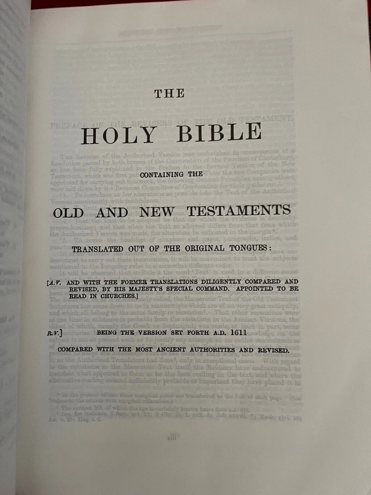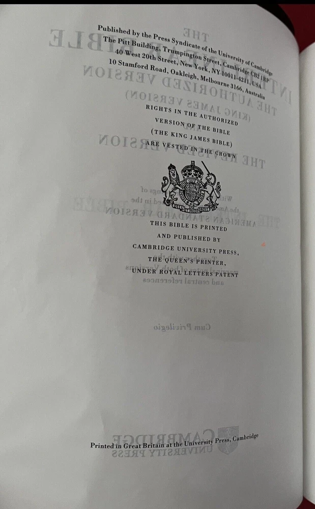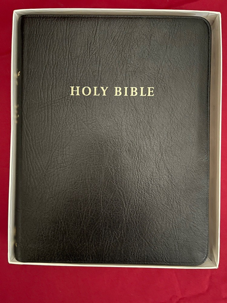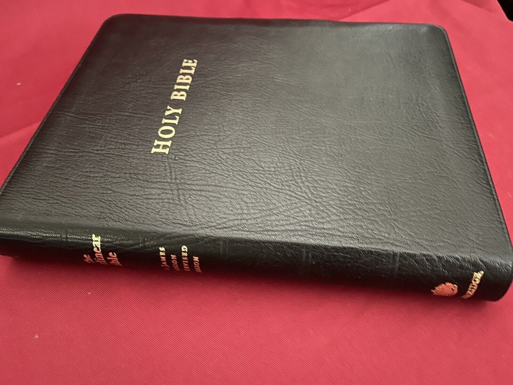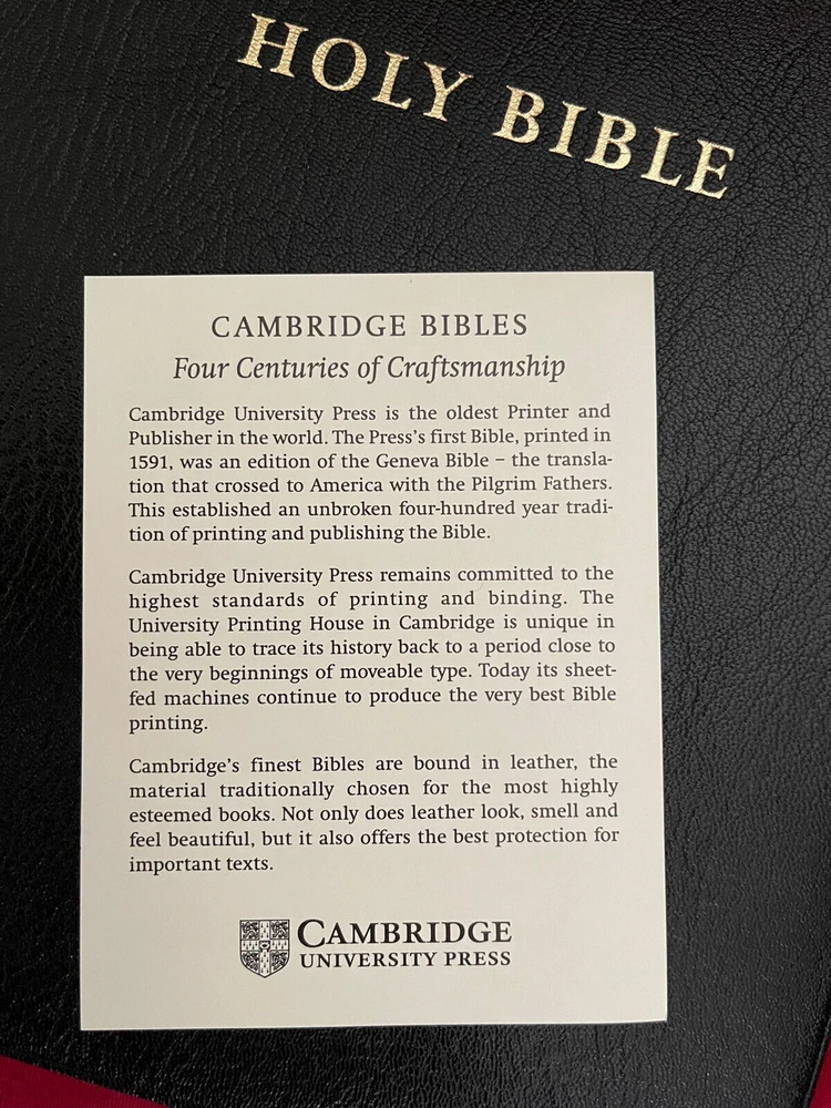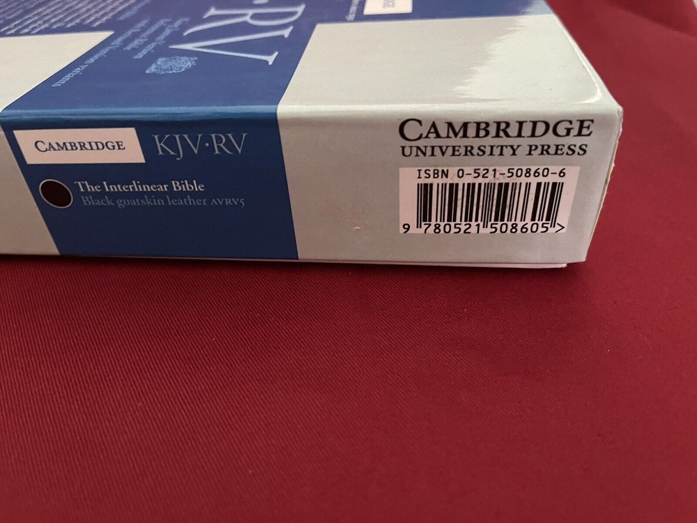New! Collector Item!! Cambridge KJV-RV The Interlinear Bible. Black Goatskin leather avrv5 Description The Interlinear Bible is really two Bibles in one. It combines the King James Version of 1611 with its first authorized successor, the Revised Version of 1885. The usual method for comparing two translations is to print the text in two parallel columns. In the Interlinear Bible, where the two texts are identical, only one line of type appears. Where there is any deviation, the RV is given as an upper line of smaller type, and the KJV as the lower line. This method immediately indicates where variations exist, yet it is possible to read either version with ease. - text of the KJV and the RV combined - cross-references from the RV - footnotes from the KJV and the RV - alphabetically arranged blank index pages - Bible Companion (a reading guide for each day of the year) - 64 pages of ruled paper for the reader's notes - 16 pages of color maps and a map index - list of variant readings preferred by the American Standard Version translation committee Product information Publisher Cambridge; Box edition (March 10, 1994) Language English Leather Bound 1684 pages ISBN-10 0521508606 ISBN-13 978-0521508605 Item Weight 2.91 pounds Dimensions 8 x 1.5 x 9.75 inches See photos for more information~ Ships Media Mail Insured~ ***all sales final and no returns*** Listing and template services provided by inkFrog