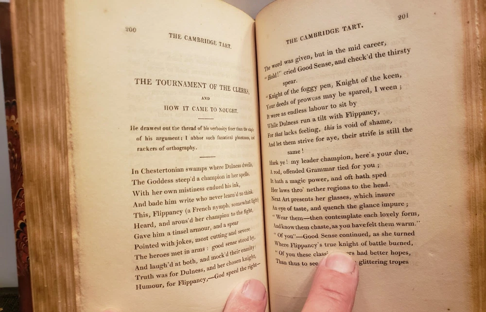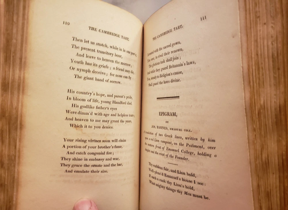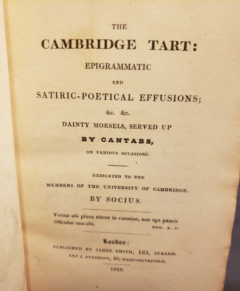 Cambridge Text Epigrammatic And Satiric-Poetical Effusions; &c, &c, Dainty Morsels, Served Up by Cantabs, on various occasions. Dedicated to the members of the University of Cambridge, by Socius. London: Published by James Smith, 163, Strand. and J. Anderson, 40, West-Smithfield.1st 1823. Fine Binding. Condition is Very Good. Shipped with USPS media Mail. Dark brown leather over marbled boards. The spine is decorated with extra Gilt with a gilt title on a brown label. Top edge Gilt. endpapers marbled. 289pp plus a couple extra of additional blanks. The book is clean and tight.