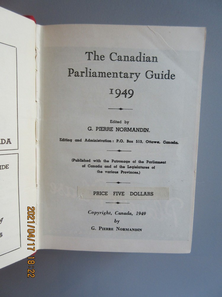 # 5865 to # 5871 Canadian Parliamentary Guide 1949 G. Pierre Normandin 795 Pages. Dimensions : 6" ¼ x 4" ½ Weight : 556 grammes Private Collection Smoke-free home