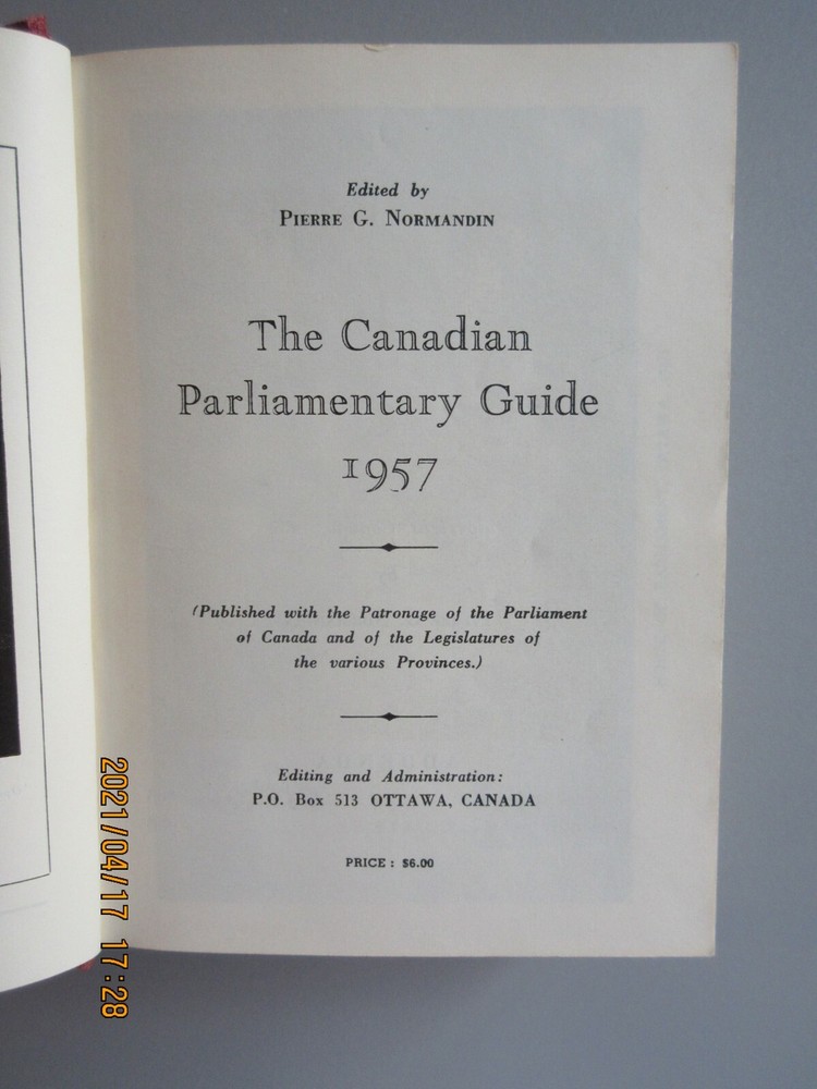 # 5854 to # 5859 Canadian Parliamentary Guide 1957 G. Pierre Normandin 863 Pages. Dimensions : 6" ¼ x 4" ½ Weight : 620 grammes Private Collection Smoke-free home...