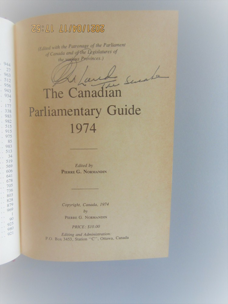 # 5861 to # 5864 Canadian Parliamentary Guide 1974 G. Pierre Normandin 996 Pages. This copy was owned by Paul Lafond Canadian Senator (1919-1988) Dimensions : 6" ¼ x 4" ½ Weight : 670 grammes Private Collection Smoke-free home