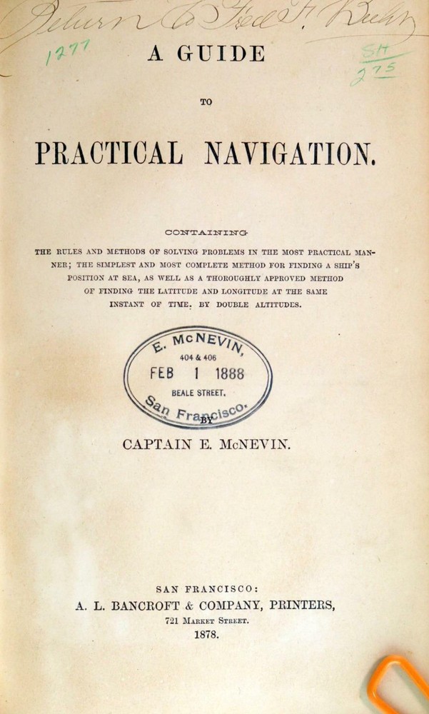 Leather. 8vo. Published by A. L. Bancroft & Company, San Francisco, CA. 1878. 324 pgs. Bound in 3/4 black calf leather and matching cloth boards with titles present to the spine and front board. Boards have light shelf-wear present to the extremities. Ed McNevin stamp present to the title page. Previous owner's name present to the title page. Text is clean and free of marks. Binding tight and solid. Captain Edmund McNevin was born in Ireland left for the US in 1847 on The Great Western. For nearly twenty-five years he commanded a variety of ships. He moved to San Francisco in 1874 and opened a school for Navigation. This is one of several authoritative nautical works he published. Captain Edmund McNevin 1878 A Guide to Practical Navigation Nautical Text Captain Edmund McNevin 1878 A Guide to Practical Navigation Nautical Text Description Up For Sale Today is A Guide to Practical Navigation Containing The Rules and Methods of Solving Problems in the Most Practical Manner; the Simplest and Most Complete Method for Finding a Ship's Position at Sea, as Well as a Thoroughly Approved Method of Finding the Latitude and Longitude at the Same Instant of Time. By Double Altitudes by Captain Edmund McNevin Leather. 8vo. Published by A. L. Bancroft & Company, San Francisco, CA. 1878. 324 pgs. Bound in 3/4 black calf leather and matching cloth boards with titles present to the spine and front board. Boards have light shelf-wear present to the extremities. Ed McNevin stamp present to the title page. Previous owner's name present to the title page. Text is clean and free of marks. Binding tight and solid. FROM WIKIPEDIA: Captain Edmund McNevin was born in Ireland left for the US in 1847 on The Great Western. For nearly twenty-five years he commanded a variety of ships. He moved to San Francisco in 1874 and opened a school for Navigation. This is one of several authoritative nautical works he published. OUR MISSION STATEMENT: Our goal is to provide the best books for the lowest prices. We understand that you have more choices than ever to buy books, so we strive to provide the best service, accurate descriptions, the cheapest shipping and the best customer service in the realm of bookselling. Thank you for visiting this listing and we hope to see you again soon! Book formats and corresponding sizes Name Abbreviations Leaves Pages Approximate cover size (width × height) inches cm folio 2º or fo 2 4 12 × 19 30.5 × 48 quarto 4º or 4to 4 8 9½ × 12 24 × 30.5 octavo 8º or 8vo 8 16 6 × 9 15 × 23 duodecimo or twelvemo 12º or 12mo 12 24 5 × 7⅜ 12.5 × 19 sextodecimo or sixteenmo 16º or 16mo 16 32 4 × 6¾ 10 × 17 octodecimo or eighteenmo 18º or 18mo 18 36 4 × 6½ 10 × 16.5 trigesimo-secundo or thirty-twomo 32º or 32mo 32 64 3½ × 5½ 9 × 14 quadragesimo-octavo or forty-eightmo 48º or 48mo 48 96 2½ × 4 6.5 × 10 sexagesimo-quarto or sixty-fourmo 64º or 64mo 64 128 2 × 3 5 × 7.5 ALL ITEMS ARE DESCRIBED TO THE BEST OF MY ABILITY! PLEASE CHECK ALL THE PHOTOS BEFORE BIDDING! PAYMENT IS DUE WITHIN FOUR (4) DAYS OF THE INVOICE! Import duties, taxes and charges are not included in the item price. These charges are the buyer's responsibility. Please check with your country's customs office to determine what these additional costs will be prior to bidding/buying. These charges are typically collected by the delivering freight (shipping) company or when you pick the item up. We do not mark merchandise values below value or mark items as "gifts" as US and International government regulations prohibit such behavior. (This is a felony in the United States) 300+ Listing Templates! Auctiva gets you noticed! THE simple solution for eBay sellers. Track Page Views With Auctiva's FREE Counter