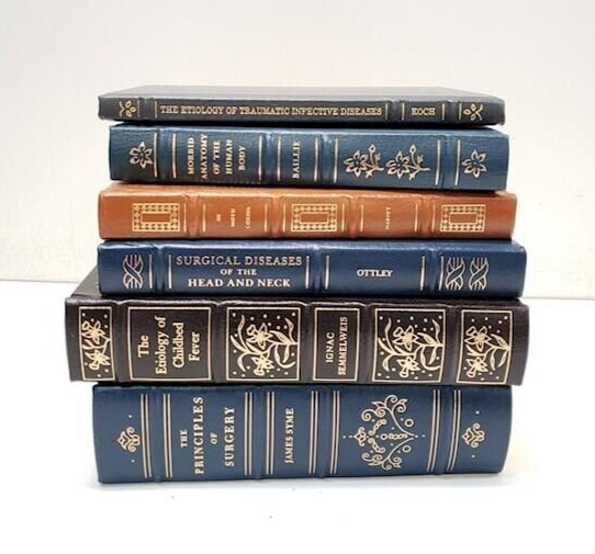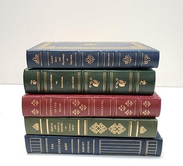 Classics of Medicine Library 11 Volumes. Medical books Publisher: Privately Printed for Classics of Medicine Library. Facsimile Edition of First Editions. Leather Bound, Ribbon Bookmark, Gilt titles, design & edges. Weight: 22 lbs. - - - - - - - - - - - - - - - * * NOTE: For Buyer/Seller security, "Signature Delivery Confirmation" service (+$5.00) will be added to your items delivery total. * * NOTE: Qualified Buyer/Bidder must have at least 5 eBay transactions with positive feedback. This Item will NOT be sold to buyers with less than 5 eBay transactions. USA Delivery ONLY. - - - - - - - - - - - - - - - 11 Assorted Medical Books: The Principles of Surgery by James Syme, The Etiology of Childhood Fever, The Etiology of Traumatic Infective Diseases, Surgical Diseases of the Head and Neck by Ottley, Morbid Anatomy of the Human Body, The Pituitary body by Cushing Medical and surgical memoirs by Smith Infections of the Hand by Kanavel Observations on Aneurism by J.E. Erichsen Gastric Juice and physiology of Digestion by William Beaumont De Motu Cordis by William Harvey