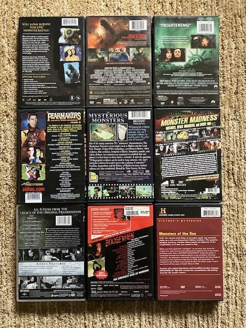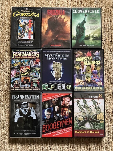 Collection of 9 monster/horror dvds, all in like new condition: 1) Monster Madness: Mutants, Space Invaders, and Drive Ins; 2) Fearmakers: Masters of Terror and Suspense; 3) Boogeymen: The Killer Compilation; 4) The Mysterious Monsters; 5) Monsters of the Sea (History Channel); 6) Frankenstein: Complete Legacy Collection; 7) Godzilla (new and sealed); 8) Mothra v. Godzilla; 9) Cloverfield. Shipping by USPS Media Mail.