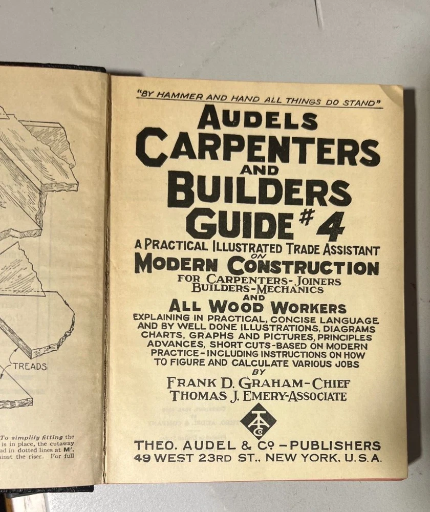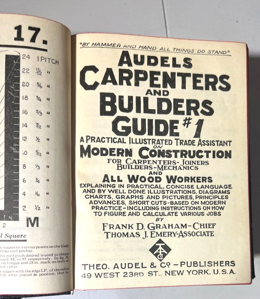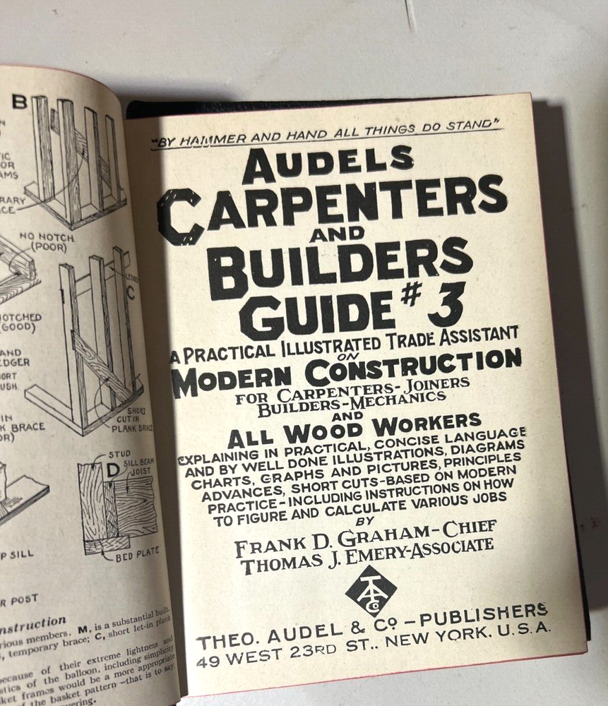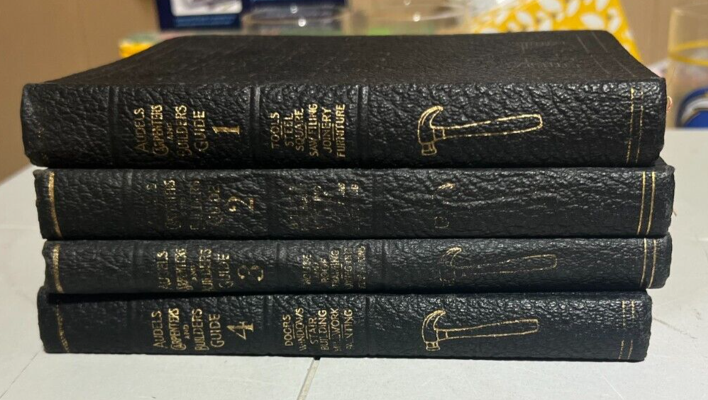 Complete Set of Audel's Carpenters and Builders Guide Volumes 1-4, Vintage 1945. Very good condition for the age. Leather in good condition, binding tight, pages clean. Corners are bent. Please Look at the Pictures as they are part of the description.