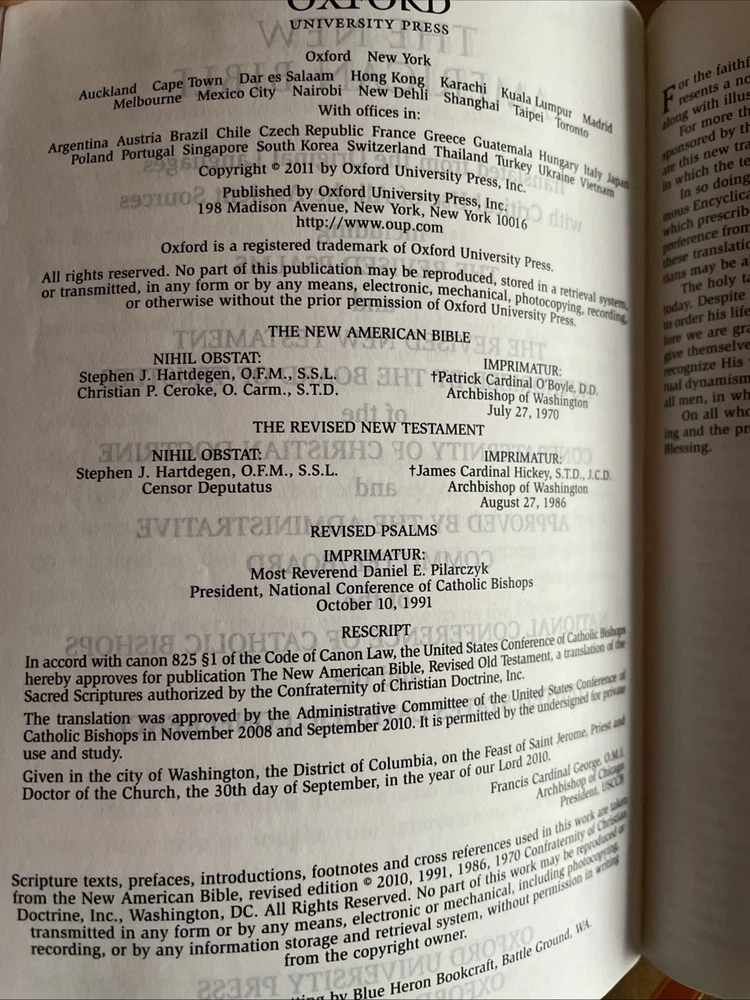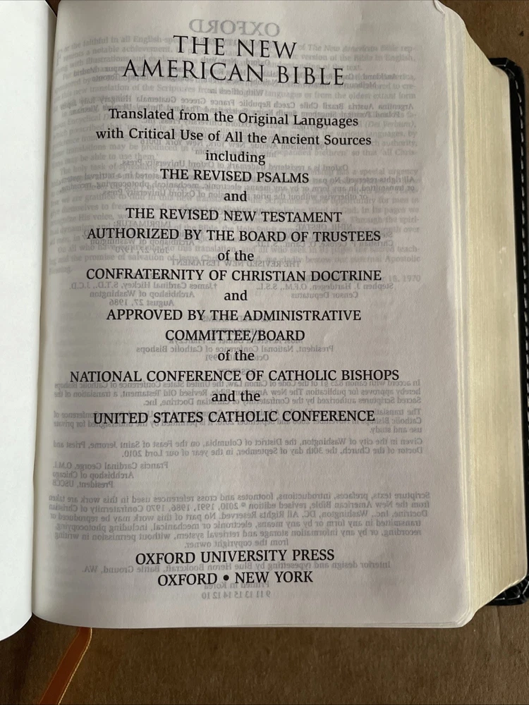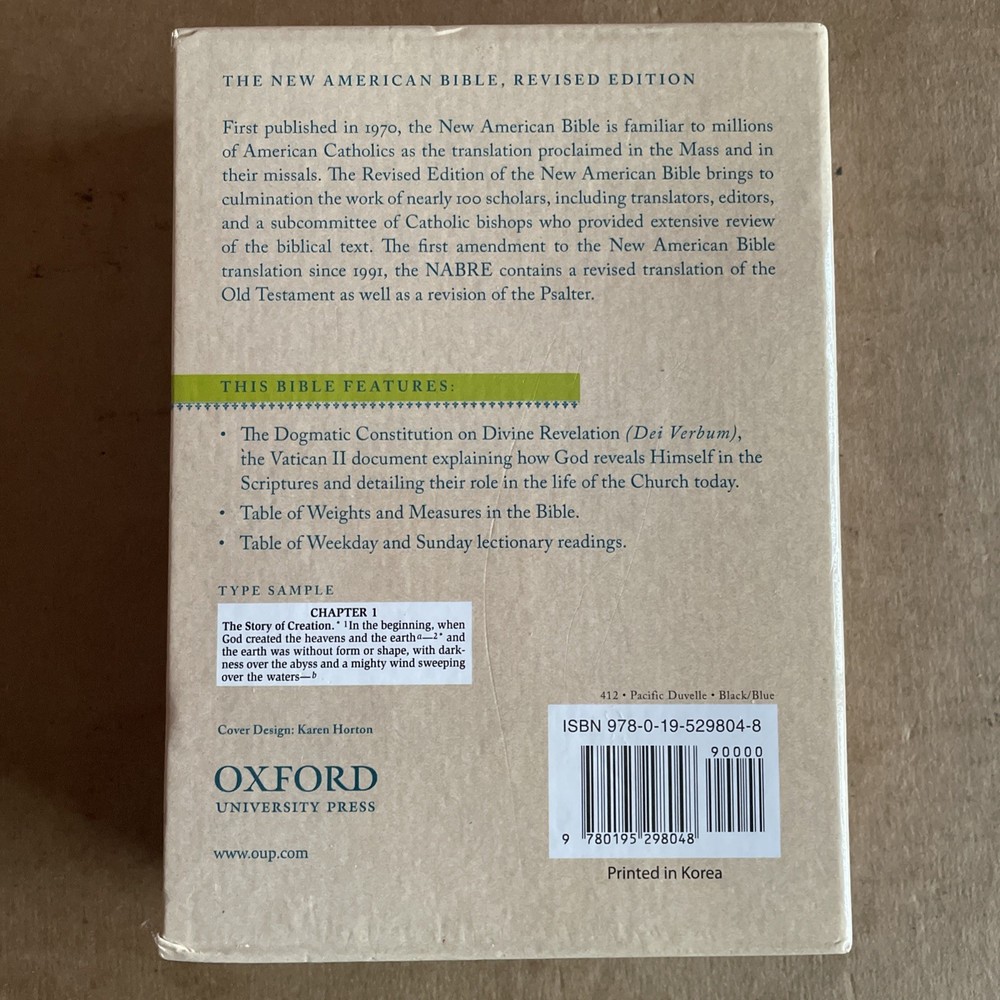 | Synopsis | The NABRE Compact Edition is a light and portable version of Oxford's popular Catholic Bible. This handsome edition, which comes in a protective slipcase, is bound in tan/blue Pacific Duvelle(R)--a sturdy, flexible, and attractive synthetic binding. Compact size and supremely affordable value make this a perfect edition for school and church use. The Compact Edition is available in three attractive bindings: black Duradera(R) (with a zipper closure), black/blue Pacific Duvelle(R), and paperback. Printed on smooth, durable paper in a clear typeface and easy-to-navigate format, the NABRE Compact Edition is easy to use and fits perfectly in a purse or bag. This slim, portable edition is packed with all the same trusted features that have made Oxford New American Bible volumes the best Bible versions available. The New American Bible Revised Edition: The New American Bible Revised Edition (NABRE) brings to culmination the work of nearly 100 scholars, including translators, editors, and a subcommittee of Catholic bishops who provided extensive review of the biblical text over a period of many years. The NABRE is the first major amendment to the New American Bible translation since 1991. It features: *The first update of the Old Testament since 1970, taking into account recent archaeological and textual discoveries. *Complete revision of the Psalter., The NABRE Compact Edition is a light and portable version of Oxford's popular Catholic Bible. This handsome edition is bound in tan/blue Pacific Duvelle--a sturdy, flexible, and attractive synthetic binding. Compact size and supremely affordable value make this a perfect edition for school and church use. The Compact Edition is available in three attractive bindings: black Duradera (with a zipper closure), black/blue Pacific Duvelle, and paperback. Printed on smooth, durable paper in a clear typeface and easy-to-navigate format, the NABRE Compact Edition is easy to use and fits perfectly in a purse or bag. This slim, portable edition is packed with all the same trusted features that have made Oxford New American Bible volumes the best Bible versions available.The New American Bible Revised Edition:The New American Bible Revised Edition (NABRE) brings to culmination the work of nearly 100 scholars, including translators, editors, and a subcommittee of Catholic bishops who provided extensive review of the biblical text over a period of many years. The NABRE is the first major amendment to the New American Bible translation since 1991. It features: *The first update of the Old Testament since 1970, taking into account recent archaeological and textual discoveries.*Complete revision of the Psalter., The NABRE Compact Edition is a light and portable version of Oxford's popular Catholic Bible. Durable binding, compact size, and supremely affordable value make this a perfect edition for school and church use., The NABRE Compact Edition is a light and portable version of Oxford's popular Catholic Bible. This handsome edition is bound in tan/blue pacific duvelle--a sturdy, flexible, and attractive synthetic binding. Compact size and supremely affordable value make this a perfect edition for school and church use. The Compact Edition is available in three attractive bindings: black duradera (with a zipper closure), black/blue pacific duvelle, and paperback. Printed on smooth, durable paper in a clear typeface and easy-to-navigate format, the NABRE Compact Edition is easy to use and fits perfectly in a purse or bag. This slim, portable edition is packed with all the same trusted features that have made Oxford New American Bible volumes the best Bible versions available.The New American Bible Revised Edition:The New American Bible Revised Edition (NABRE) brings to culmination the work of nearly 100 scholars, including translators, editors, and a subcommittee of Catholic bishops who provided extensive review of the biblical text over a period of many years. The NABRE is the first major amendment to the New American Bible translation since 1991. It features: * The first update of the Old Testament since 1970, taking into account recent archaeological and textual discoveries.* Complete revision of the Psalter. |