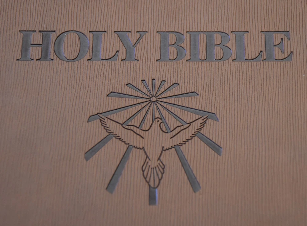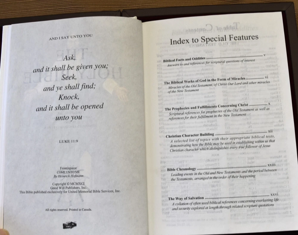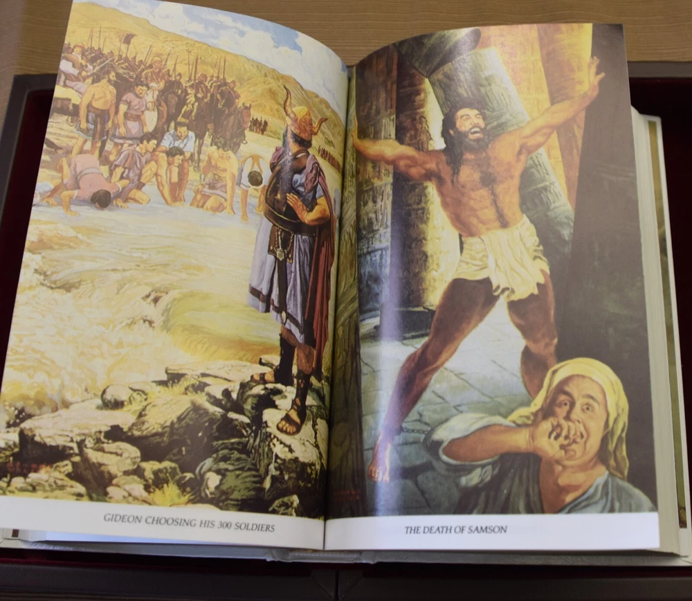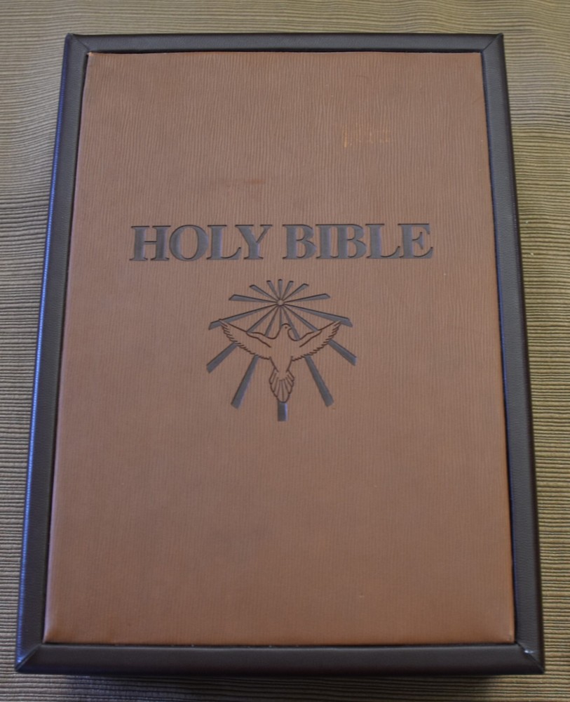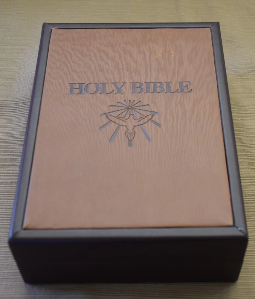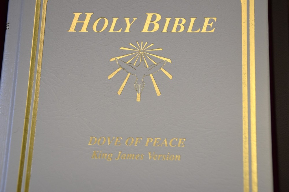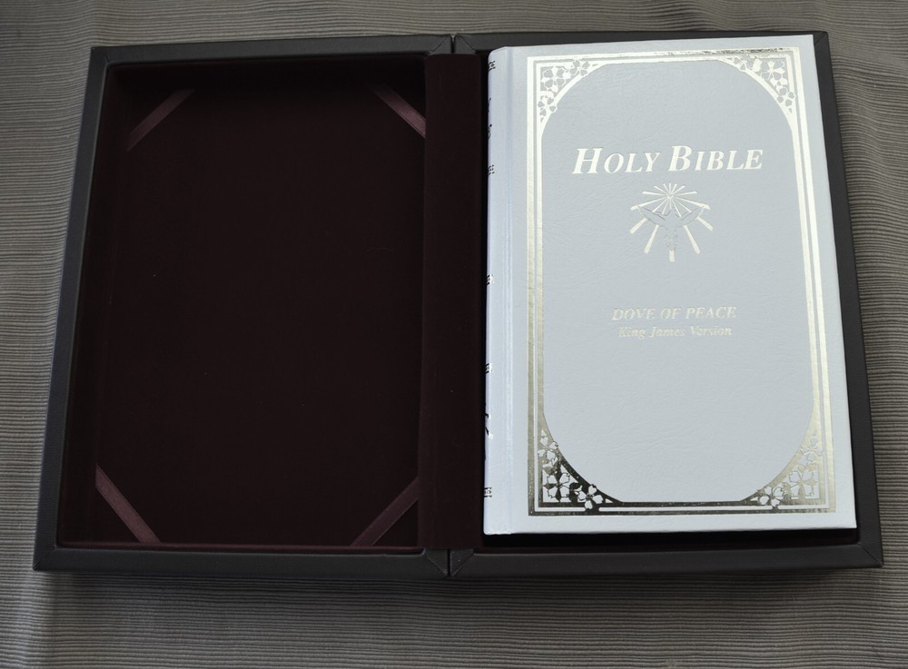 "THE HOLY BIBLE" Dove of Peace Containing The Old and New Testaments in the authorized King James Version Presentation page filled out (this is the only writing). Very good condition. Appears unread/unused. White leather book with gold gilt lettering and designs. Measures 8.5" x 6" inches approximately. Red velvet interior. The box is covered in leather. Very little wear. 0810 3324