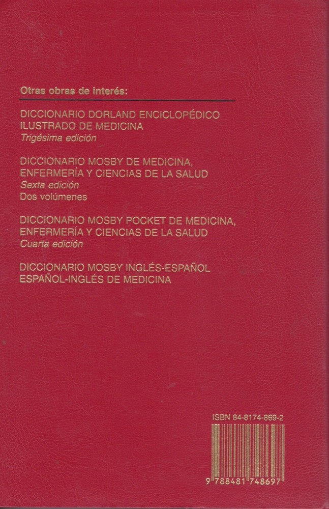 Ver todos los formatos y ediciones Diccionario de inglés/español - español/inglés, de la familia Dorland, realizado a partir de la 30.ª edición del "Diccionario Dorland Enciclopédico Ilustrado de Medicina", que durante más de 100 años ha sido y es la referencia más importante en el campo de la terminología médica. Con más de 100.000 entradas que recogen todos los términos fundamentales de Medicina y Ciencias de la Salud que estudiantes y profesionales de estas áreas necesitan conocer si quieren leer en inglés o preparar algún trabajo en este idioma. También es una herramienta fundamental para traductores profesionales especializados en estas disciplinas al tratarse, probablemente, del diccionario de idiomas más completo disponible. Para facilitar la tarea, existe una correspondencia exacta, conceptual y gramatical, entre los términos de cada uno de los dos idiomas. Realizado a partir de la 30.ª edición del "Diccionario Dorland Enciclopédico Ilustrado de Medicina", que durante más de 100 años ha sido y es la referencia más importante en el campo de la terminología médica. Con más de 100.000 entradas, es una herramienta fundamental para traductores profesionales especializados en estas disciplinas al tratarse, probablemente, del diccionario de idiomas más completo disponible.