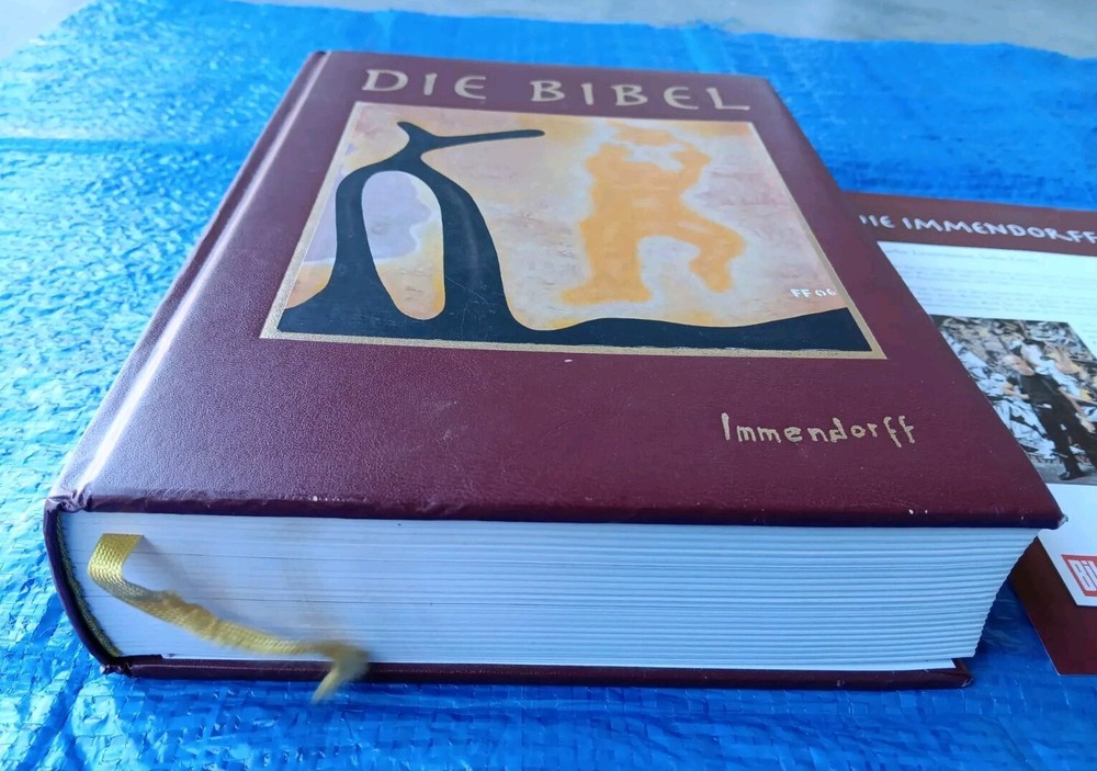 DIE BIBEL Jörg Immendorff (Altes + Neues Testament) - German Bible (2006, printed in Germany). This is Brand NEW. No writing, no bent pages. There is some light shelf wear and some light (dust or dirt) on the top of the pages. See the last picture, zoom in on all pictures.