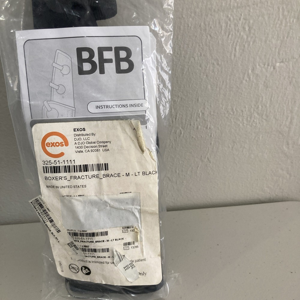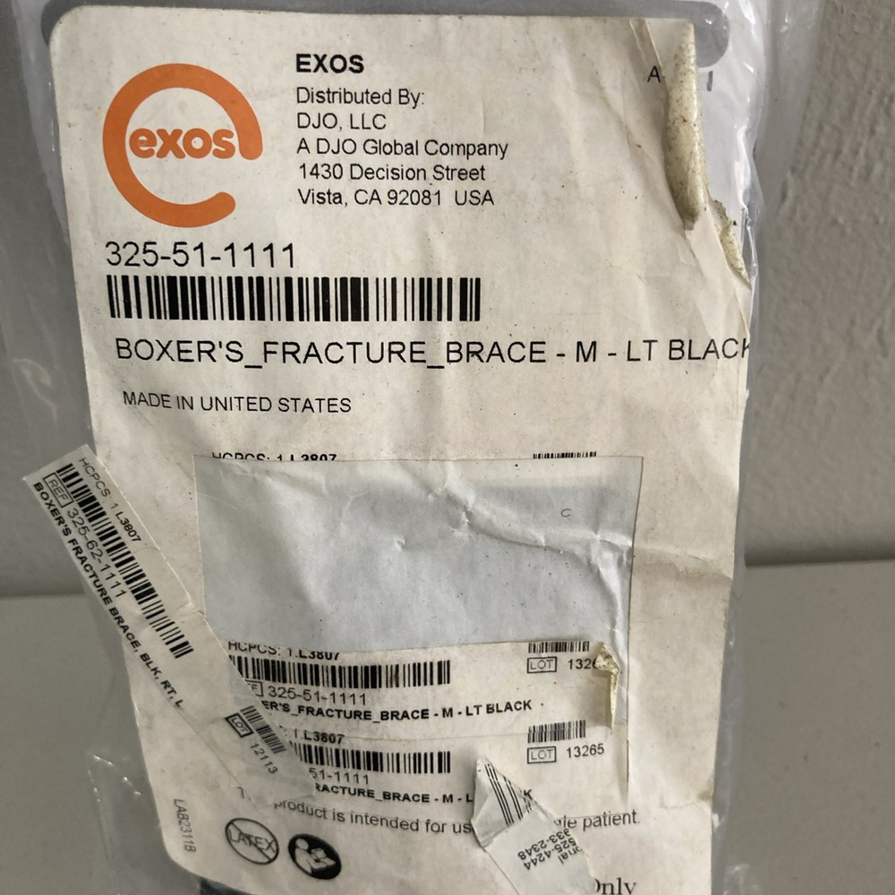 The DJO Exos Boxer's Fracture Brace is a medium-sized splint designed for the left arm, specifically targeting the hand and wrist area. Made of rigid black polymer material, this brace features a waterproof design and is suitable for both men and women. The Exos brand is known for its high-quality orthopedic products, making this brace a reliable choice for providing support and stabilization during recovery from a boxer's fracture.