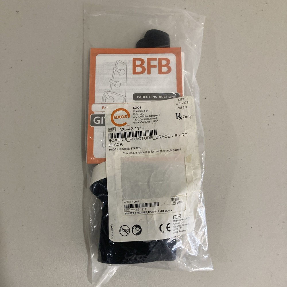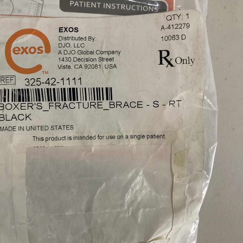 The DJO Exos Boxer's Fracture Brace is a rigid splint designed for the right arm, specifically targeting the hand area. Made of waterproof polymer material, this unisex wrist brace is thermoformable and comes in a sleek black color. The small size ensures a comfortable and secure fit for the wearer, providing support and stability for orthopedic and mobility purposes. Ideal for those looking for a durable and high-quality brace to assist with healing and recovery.