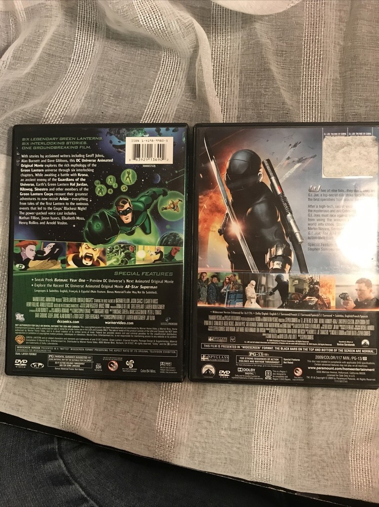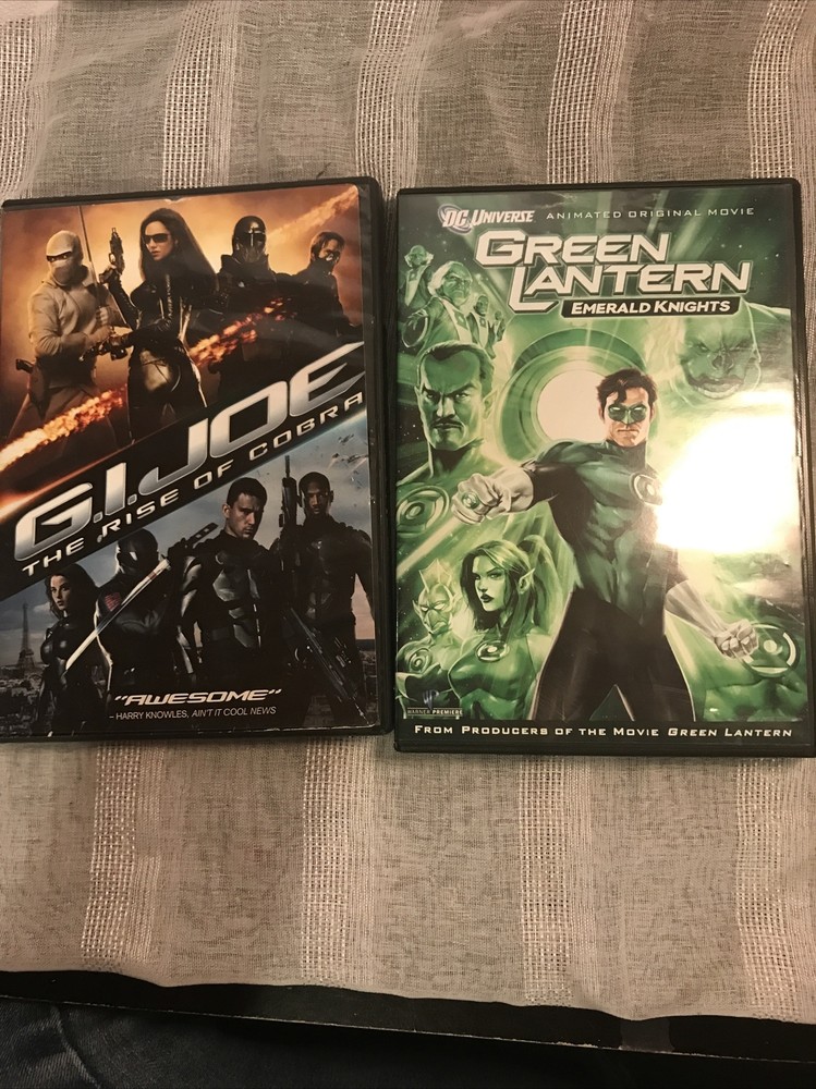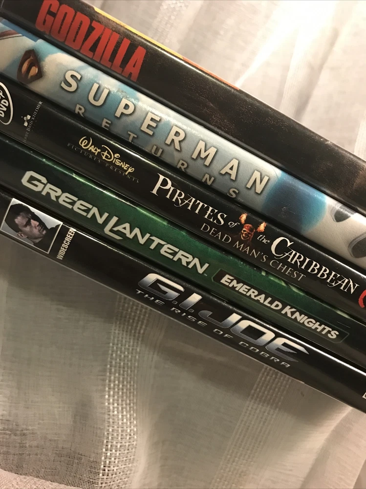 DVD BUNDLE 5 Movies Green Lantern GI Joe Godzilla Superman Pirates Of Caribbean. Family friendly PG & PG-13 action adventure movies GODZILLA - PG-13 bonus disc SUPERMAN RETURNS PG -13 PIRATES OF THE CARIBBEAN- PG -13 Dead Manโs Chest Johnny Depp Orlando Bloom Kiera Knightly GREEN LANTERN EMERALD KNIGHTS- PG G. I. JOE THE RISE OF COBRA -PG-13 Items sold as shown Please see photos for all details including condition and measurements Immediate ship will combine ship Movie bundle Family movie night!