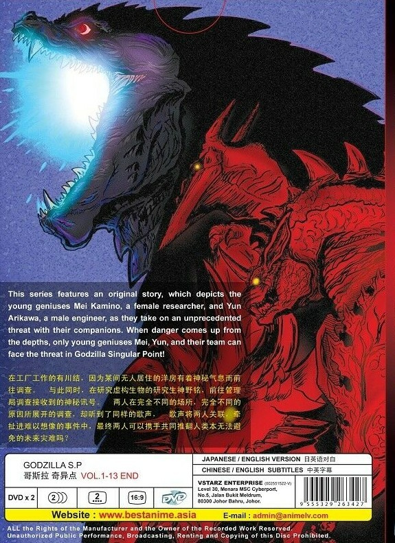 Godzilla S.P TV 1-13 End This series features an original story, which depicts the young geniuses Mei Kamino, a female researcher, and Yun Arikawa, a male engineer, as they take on an unprecedented threat with their companions. When danger comes up from the depths, only young geniuses Mei, Yun, and their team can face the threat in Godzilla Singular Point! Voice Over : Japanese / English Subtitle : English / Chinese Region Code : All Region Number of Disc : 2 Shipping & Handling - FREE POSTAGE with Tracking Number provided - Ship to WORLDWIDE except Canada , North Korea & Israel - Items will be ship by Registered International Airmail with tracking number - Items will be ship out within 1 business day (Monday to Thursday) after payment received - Items will ship to the address as per eBay's check-out . - All items will be securely packaged. Payment - I accept PAYPAL only. - Please don't hesitate to contact us if you have any questions. Return Policy - Only DEFECTIVE item will be replace promptly. - Buyer's pay for the return shipping cost.