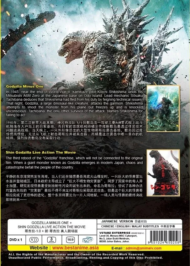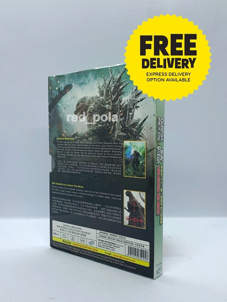 DVD Godzilla Minus One + Shin Live Action Movies (English Subtitle) - All Region Description: Number of Disc: 1 DVD Audio Language: Japanese Subtitle: English / Chinese Disc Format: NTSC (16:9) Region Code: All Region Content: Godzilla Minus One Shin Godzilla Synopsis: The Second World War hit Japan hard and reset everything to “zero”. But rebuilding the country proves to be impossible. Shortly after the war ends, Godzilla appears, and the country is on the verge of losing everything and being transferred to the “negative zone”. Item Condition: Brand New & Factory Seal and it is an Original Malaysian and Licensed item. All DVDs come with Original Sealed Authenticated Sticker / Hologram by Malaysia Censorship Board. Payment Method: We accept payment using eBay manage payment only. Shipping Method: Handling time is 1-3 working days. Your goods will be shipped with a valid tracking number. All products are packed, and layered with bubble wrap to reduce damages during shipment delivery. Economy Shipping : The products will be shipped via SingPost from Malaysia. Estimate delivery is between 11 to 23 business days. Expedited shipping : Approx 9-11 working days depending on location Tracking will be provided. Return Method: If you have any problem with the order, do contact us via eBay message. We are glad to assist you and solving the problem as soon as possible. Items can be returned within 30 days in a good condition. Other: Import duties, taxes, and additional charges are not included in the item price or shipping charges. Please be aware this custom import duties and taxes are buyer's responsibility.